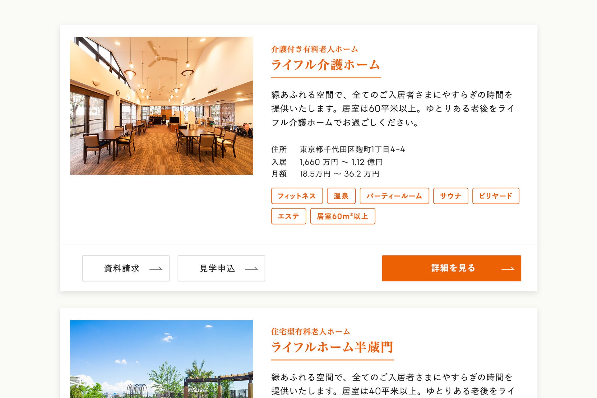高級老人ホームの開設が増えていることを受け、LIFULL介護でリニューアルした「高級老人ホーム特集」では、施設で利用できる設備やサービスをアイコンで表示し、「温泉に入れる老人ホーム」「ジムがある老人ホーム」などが一目で分かるようになり、あってほしい設備を軸にして老人ホームを比較検討する際にご活用いただけます。