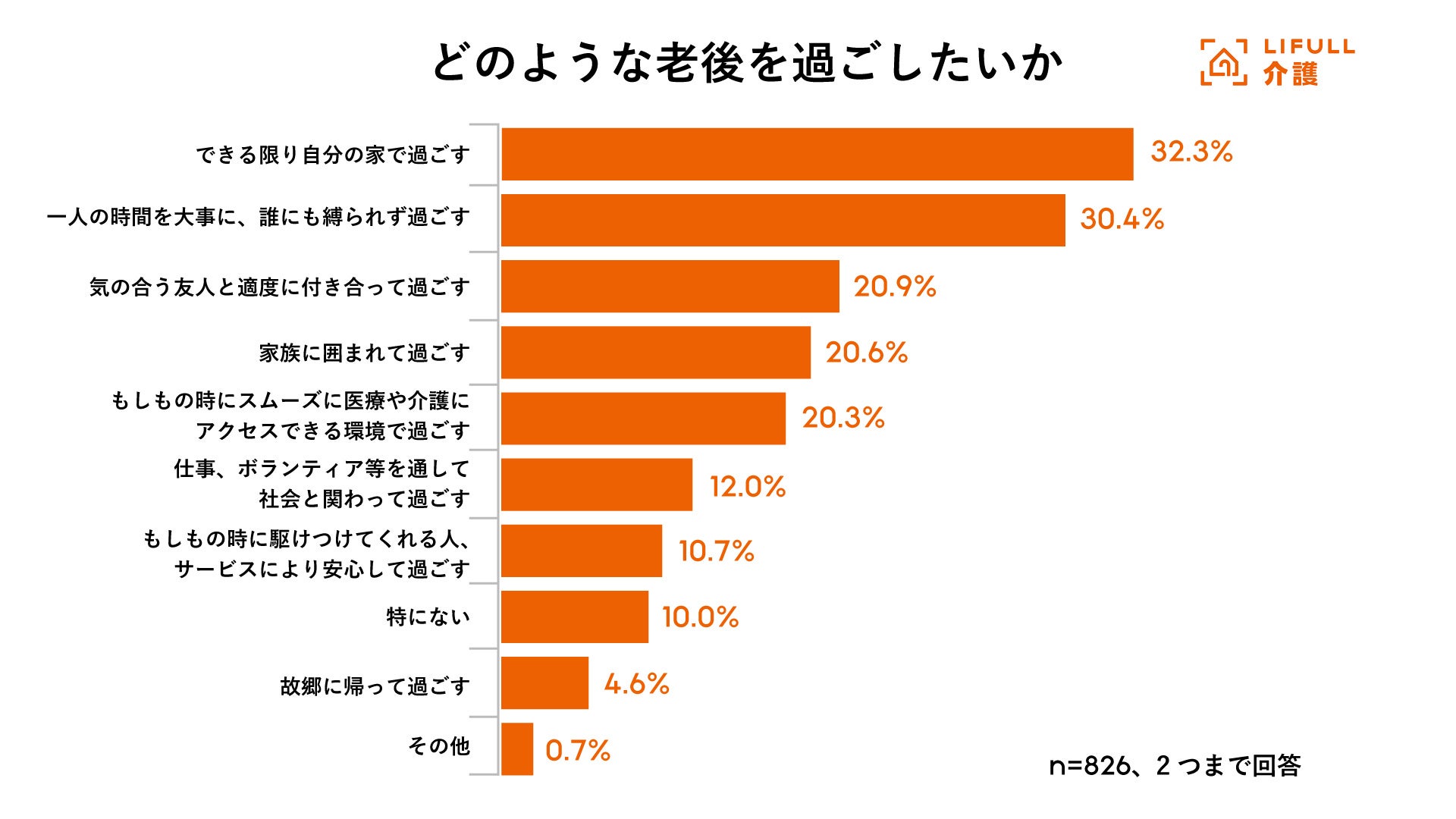 「理想の老後の過ごし方」について尋ねたところ、最も多かった回答は「できる限り自分の家で過ごす」(32.3%)でした。次いで「一人の時間を大事に、誰にも縛られず過ごす」(30.4%)と続きます。また、「気の合う友人と適度に付き合って過ごす」(20.9%)、「家族に囲まれて過ごす」(20.6%)、「もしもの時、スムーズに医療や介護にアクセスできる環境で過ごす」(20.3%)も2割以上の方が回答しています。