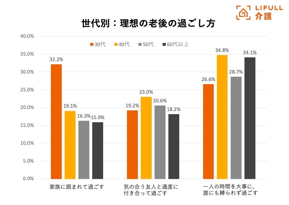 また、「家族に囲まれて過ごす」「気の合う友人と適度に付き合って過ごす」「一人の時間を大事に過ごす」を年代別に比較したところ、「家族に囲まれて過ごす」は30代(32.2%)が他の世代よりも高く、「気の合う友人と適度に付き合って過ごす」「一人の時間を大事に過ごす」はどちらも40代(23.0%、34.8%)という結果でした。なかでも60代以上は「一人の時間を大事に過ごす」(34.1%)が他の選択肢よりも15ポイント以上高く、世代別でもっとも一人で老後を過ごす志向が強いことが分かりました。