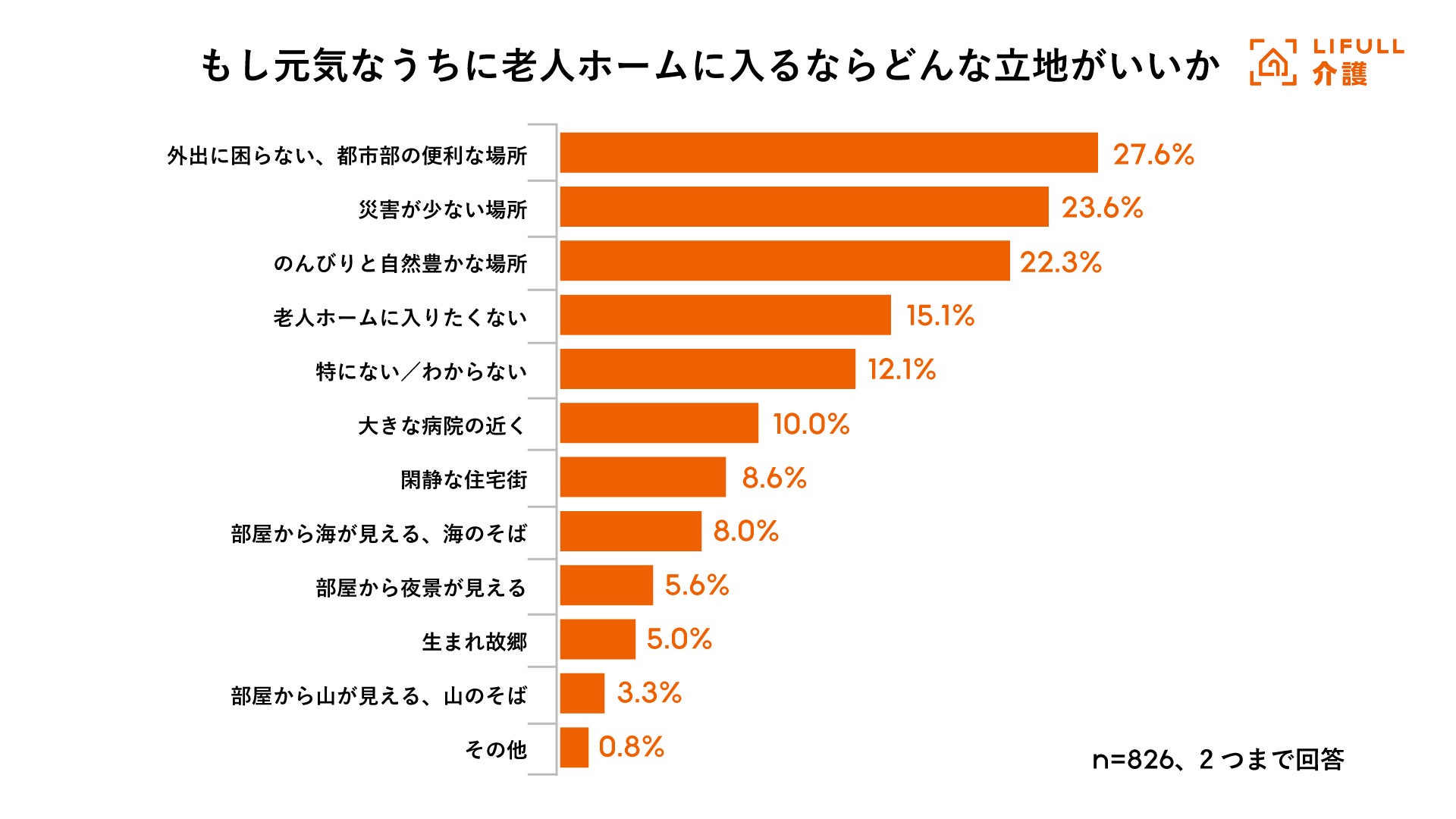 「もし元気なうちに老人ホームに入居するならどんな立地を希望するか」を尋ねたところ、最も回答が多かったのは「外出に困らない、都市部の便利な場所」(27.6%)でした。元気なうちに入居する場合は外出する機会も多いため、「都市部の便利な立地」であることが老人ホームを選ぶ際のポイントであることが分かりました。