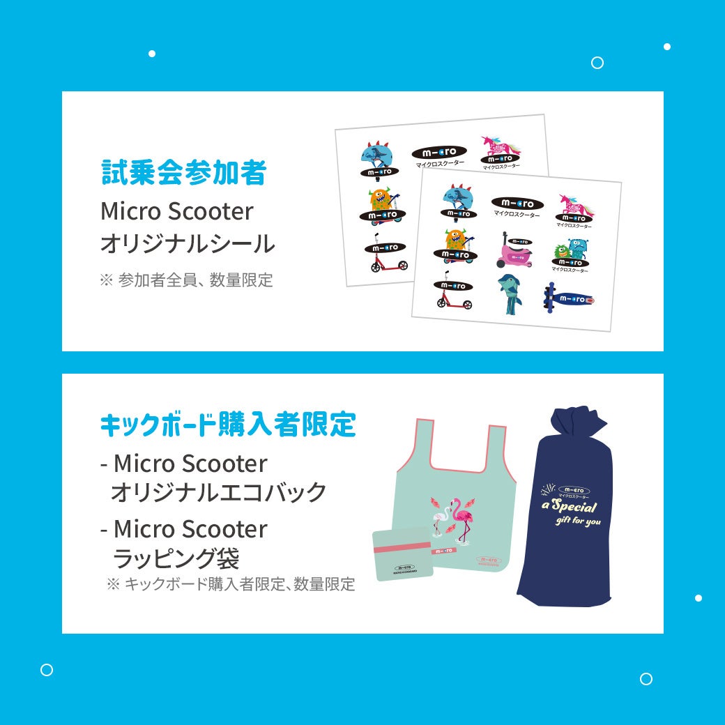 参加費は無料で、試乗するだけでマイクロオリジナルシールをプレゼント致します。また、キックボードをご購入された方にはマイクロオリジナルエコバックとマイクロラッピング袋をプレゼント致します。マイクロスクーターは、クリスマスや誕生日プレゼントとしてご購入される方が多い為、何が入っているのか開けるまでウキウキ出来るよう中身の見えないオリジナルラッピング袋を制作致しました。プレゼント品は数量限定のため、お早目のご来場をお勧めいたします。マイクロスクーターの関係者は「クリスマスシーズンを迎え、お子様に楽しんでもらえる空間となっており、たくさんのお子様のご来場をお待ちしていると明らかにしました。