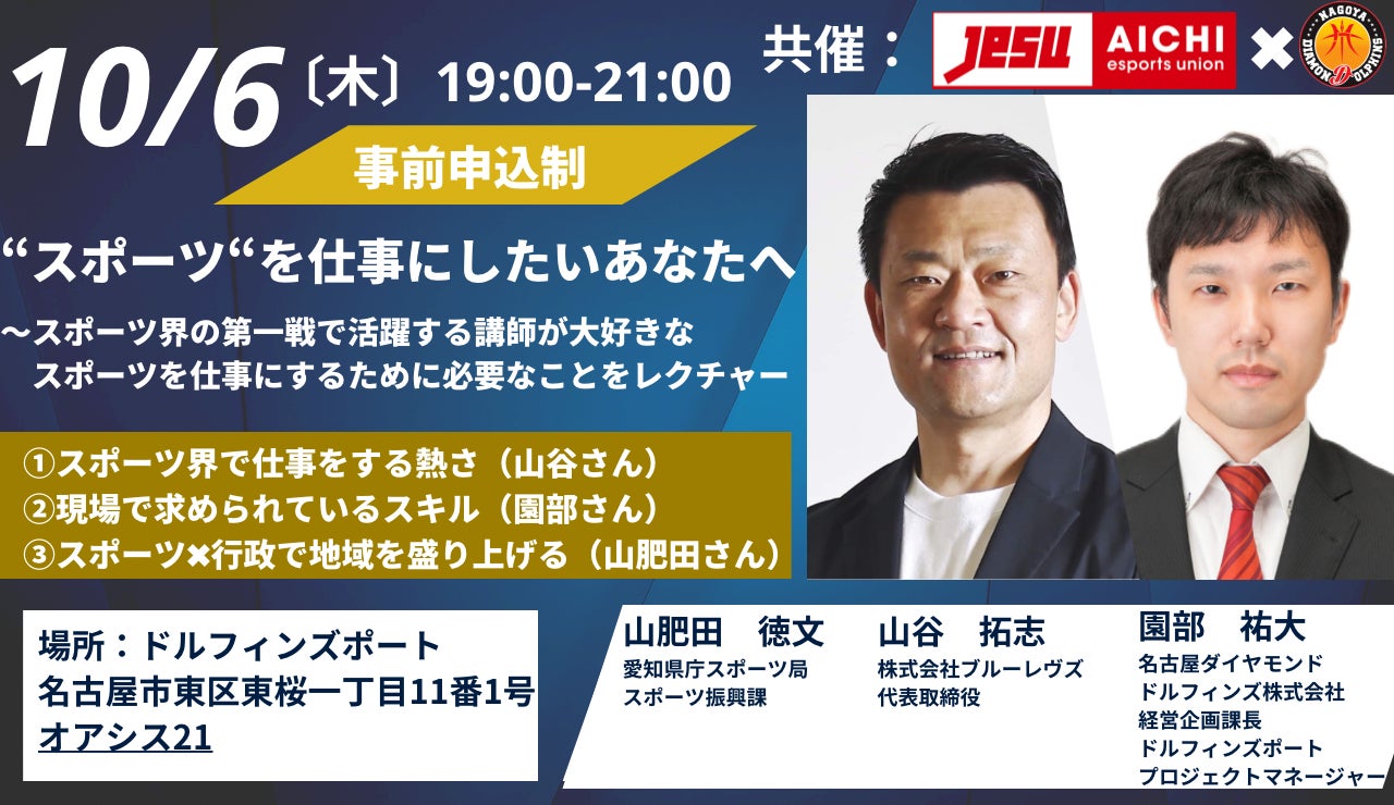 「スポーツを仕事にしたいあなたへ」と題し、プロスポーツ業界で第一線を走る方々にスポーツ業界の熱さ・リアルを存分に語っていただきます。また、行政の方にもご登壇いただき、2026年に第20回アジア競技大会(2026/愛知・名古屋)を開催するこの地域の未来について共に考える契機にいたします。