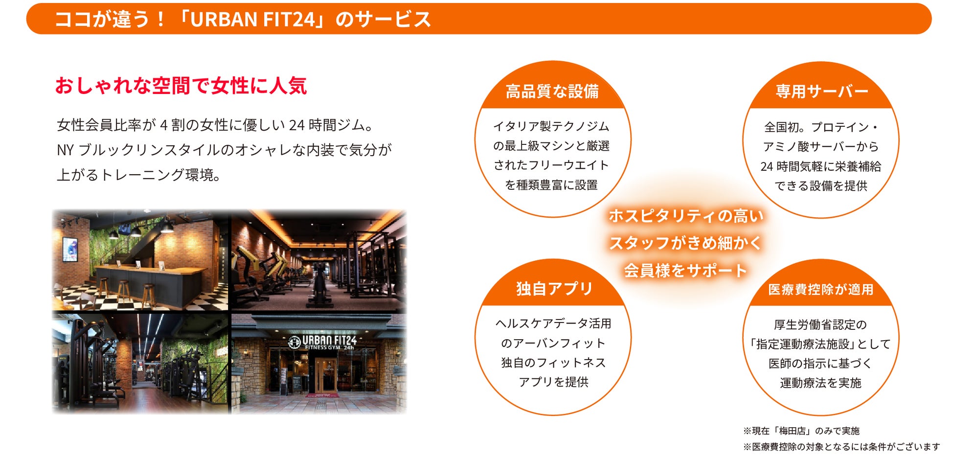 「URBAN FIT24」は、全国に20店舗を展開する(2024年4月5日時点)24時間営業のフィットネスジムです。最低限の内装とマシンを並べるだけの従来型フィットネスジムとは異なり、上質な空間とホスピタリティ豊かな質の高いサービスが特徴です。満足いただける価格で、皆様に最高のフィットネスライフを提供しています。