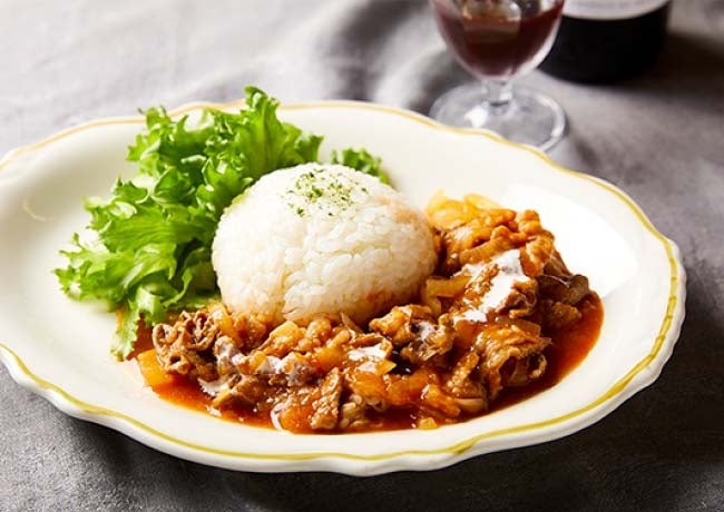 ルー不要で、タマネギ・牛肉・ケチャップの3つを入れて煮込むだけでコク旨。パンがとろみを出してくれるので、小麦粉不使用で、ダマになる心配もありません。