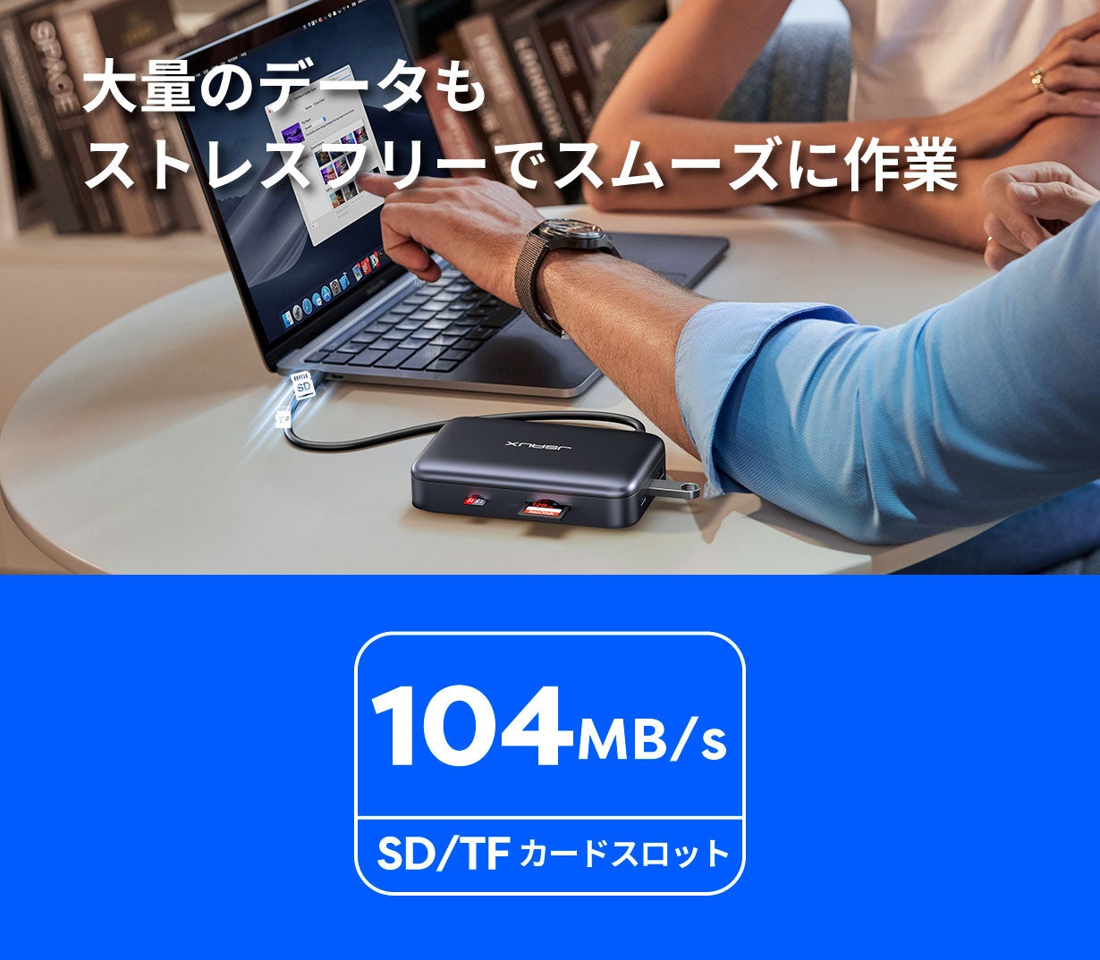 SD/TFスロットで最大読み書き速度104MB/sを誇ります。大量のデータを扱う必要がある場合でも、ストレスフリーでスムーズに作業を進めることができます。これで効率的な作業時間を手に入れることができますね。