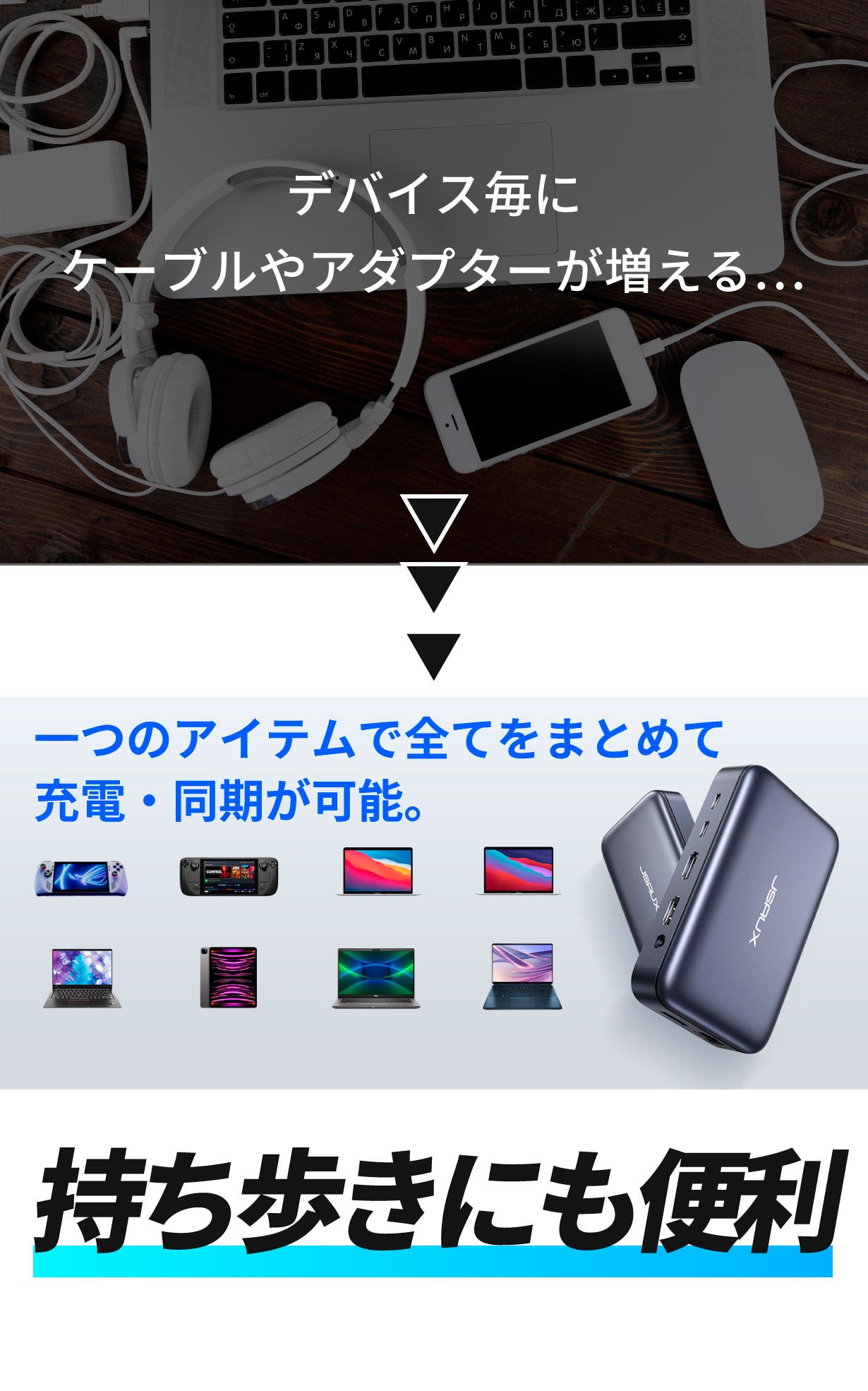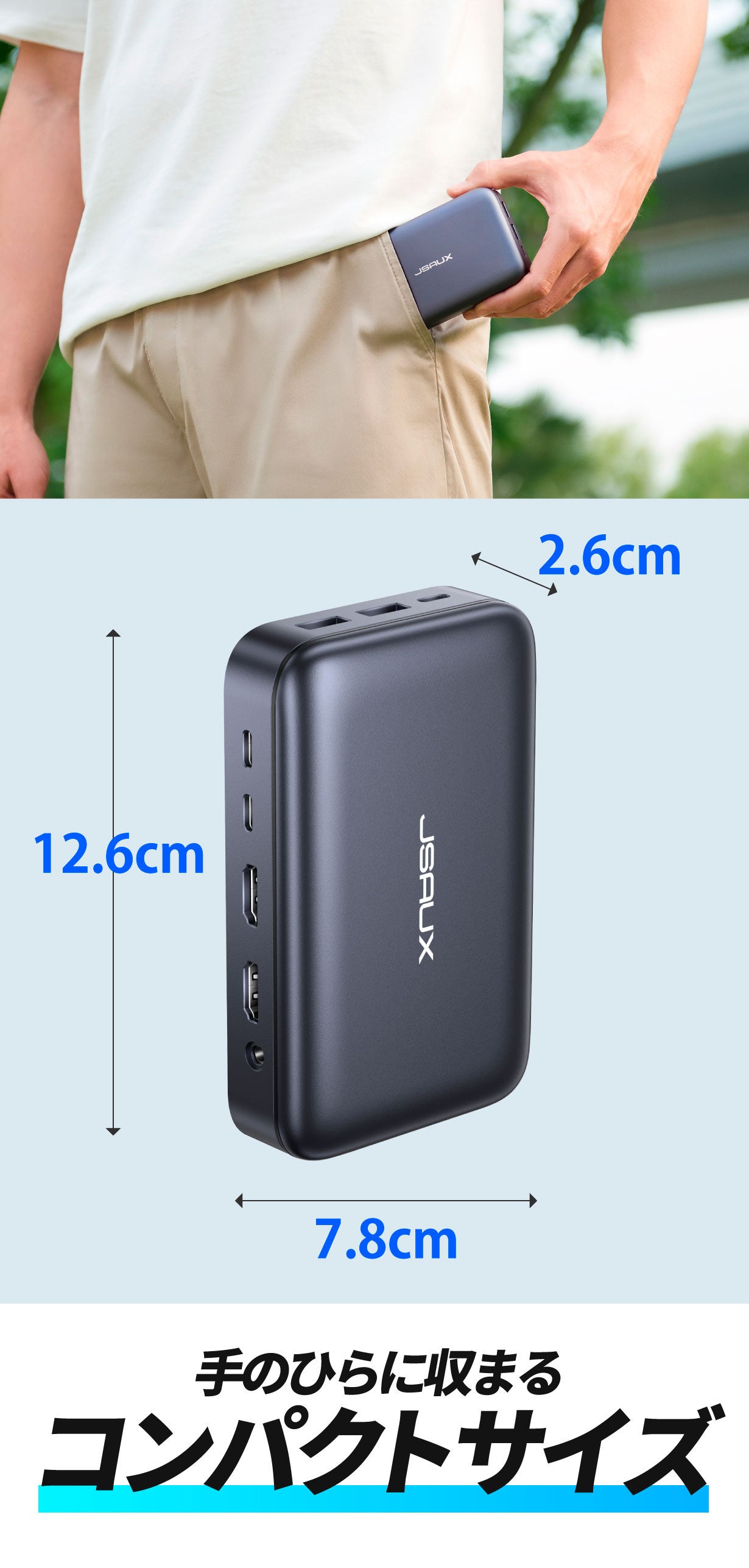 ポケットサイズながらフル機能を備えた強力なドッキングステーションです。これ一つあれば、出先でも快適に作業することが可能です。ビジネス旅行からカフェワークまで、どんなシチュエーションでもあなたの最高のパートナーになります。