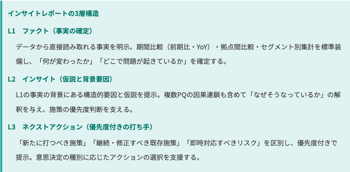 ファクト・インサイト・アクションの3層で、数値の先にある「判断」を自動構造化