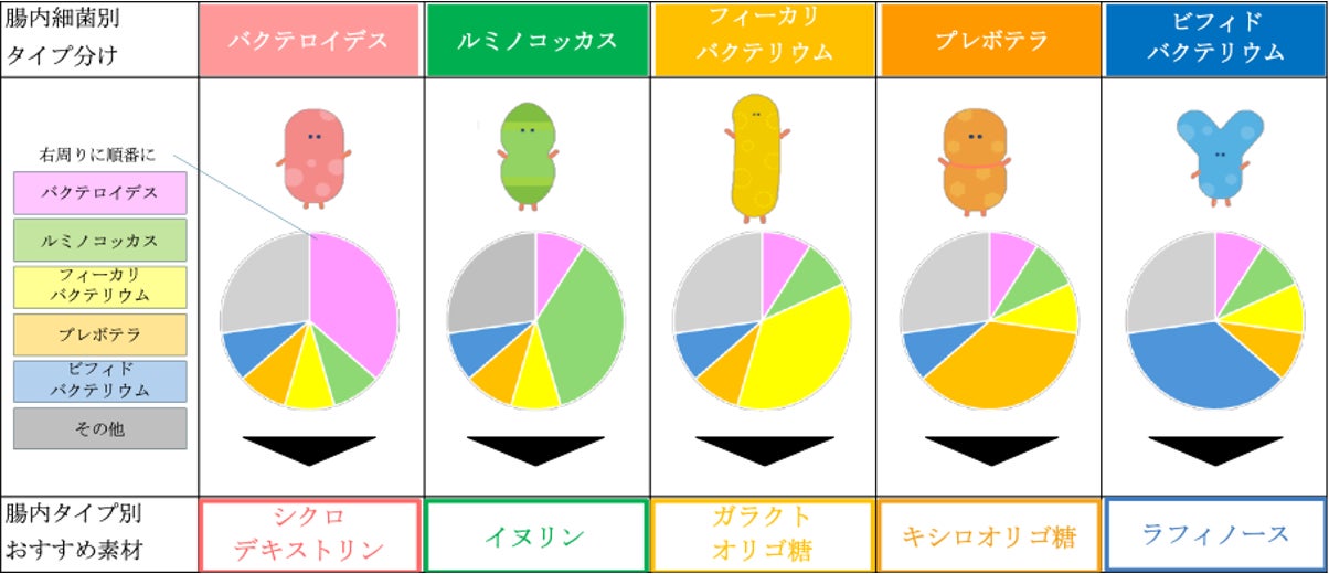 本サービスでは、腸内細菌の代表的な5菌属(バクテロイデス、ルミノコッカス、フィーカリバクテリウム、プレボテラ、ビフィドバクテリウム)の量とバランスを測定し、腸内細菌のタイプ分けを行います。そして、そのタイプにおすすめの素材を配合した商品を、全5品のラインアップの中から選定し提供します。
