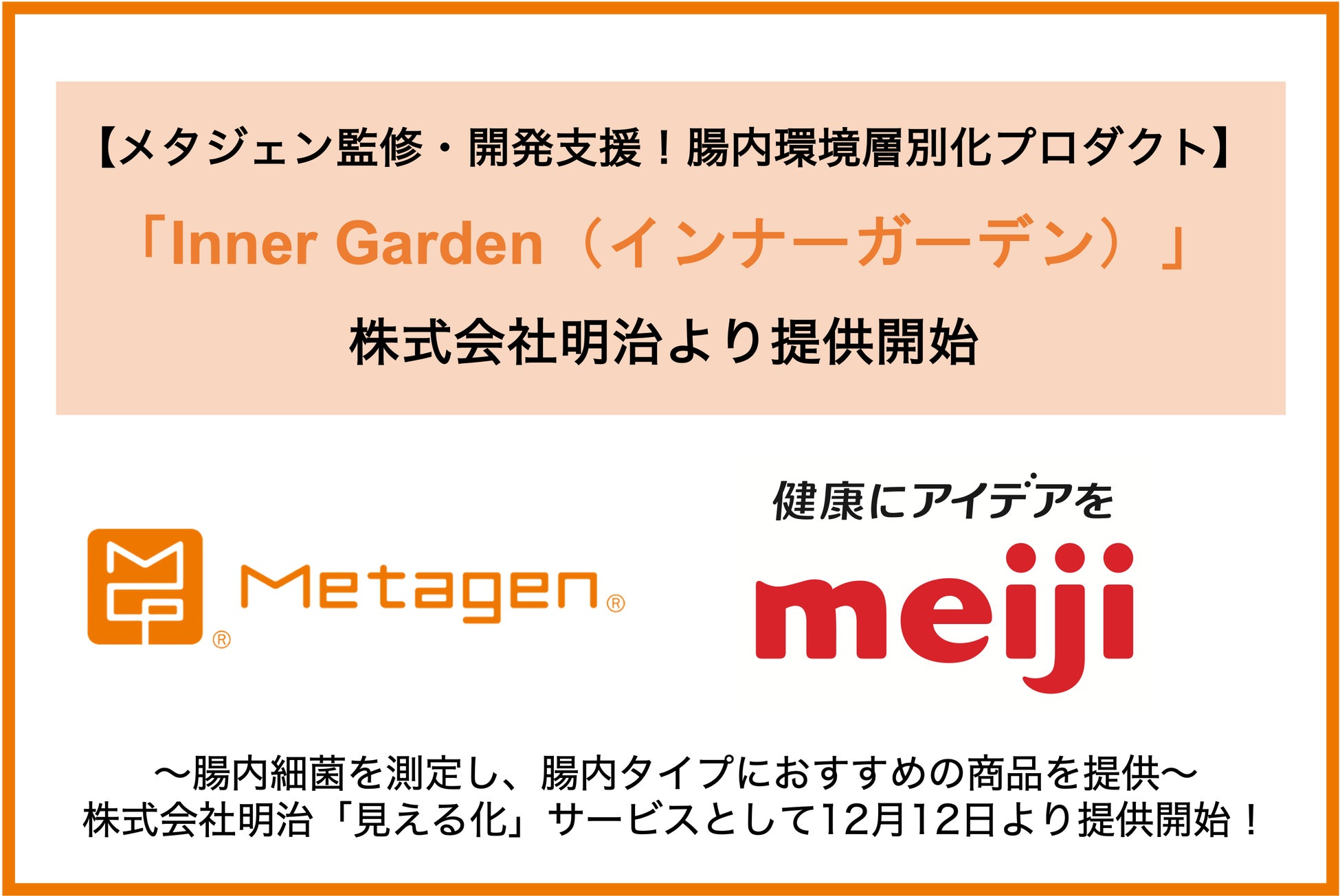 科学的根拠に基づいて腸内環境をデザインすることで、一人ひとりの健康を実現する株式会社メタジェン(本社:山形県鶴岡市、代表取締役社長CEO:福田真嗣、以下「当社」)は、この度、株式会社明治(代表取締役社長:松田克也、以下「明治社」)と連携し、腸内細菌を測定し、腸内タイプに合った素材を配合した商品を提供する腸内タイプ別パーソナルケア 「Inner Garden(インナーガーデン)」の監修・開発支援を行いました。当商品は、明治「見える化」サービスとして、2024年12月12日より明治社のECにて販売開始となります。