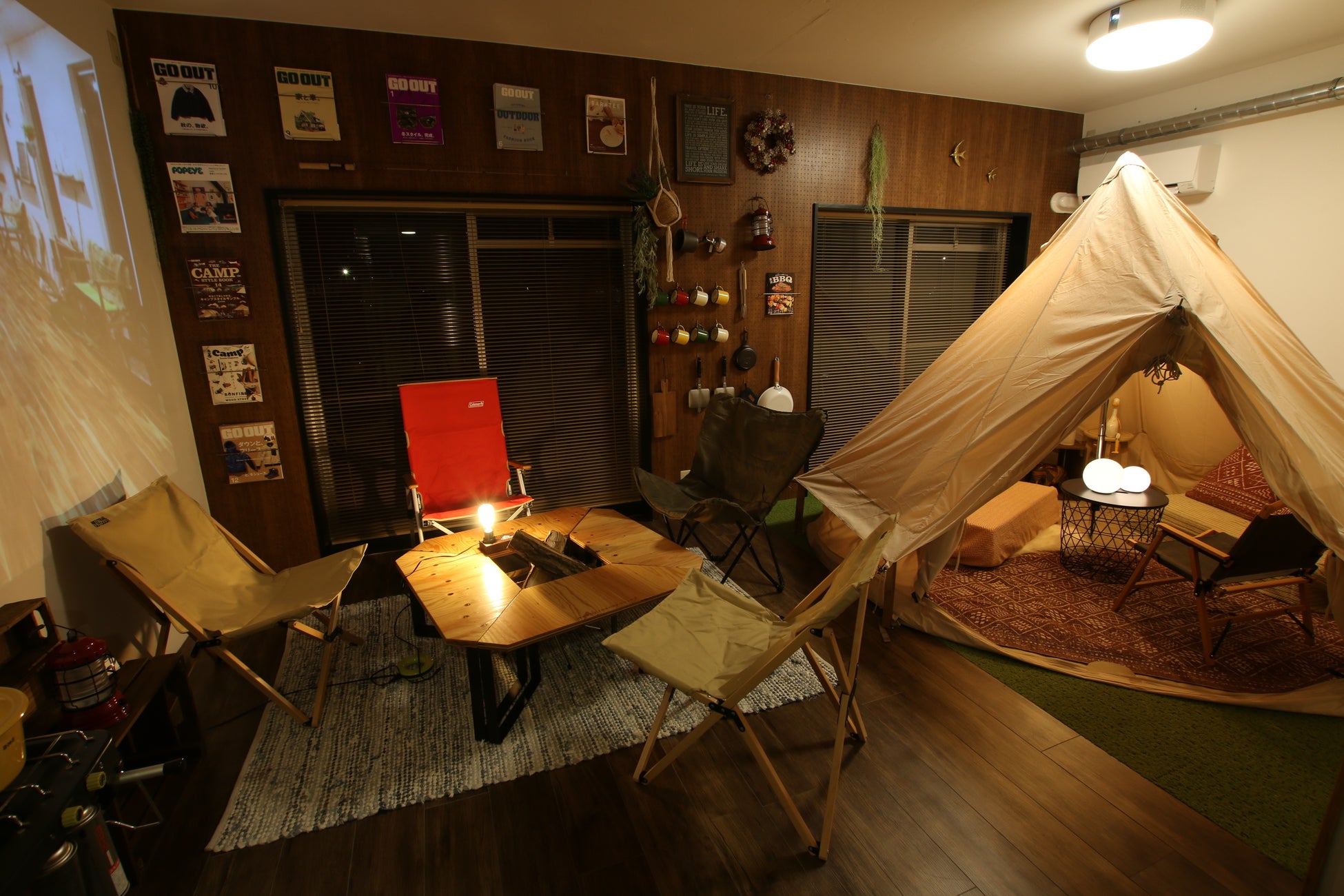 夏でも冬でもオールシーズン気軽にキャンプ気分が楽しめる屋内型キャンプ場をコンセプトにデザインされたお部屋です。