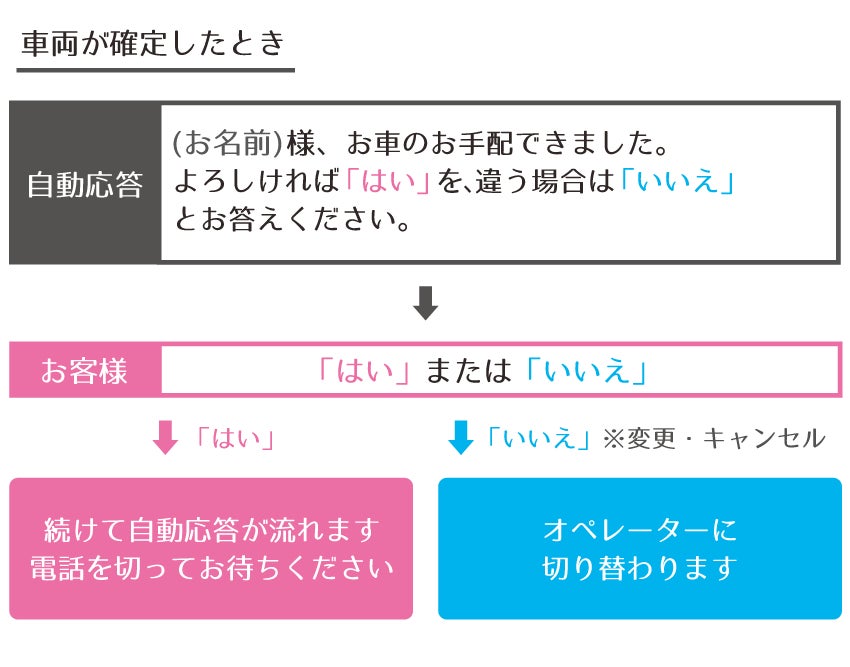 お客様からタクシーのご注文をいただいた後、一部の配車において、①「お迎えの車両が確定した時」②「お迎えの車両が到着した時」③「車両が見つからない時」に、自動応答でお客様にお電話をさせていただく仕組みです。