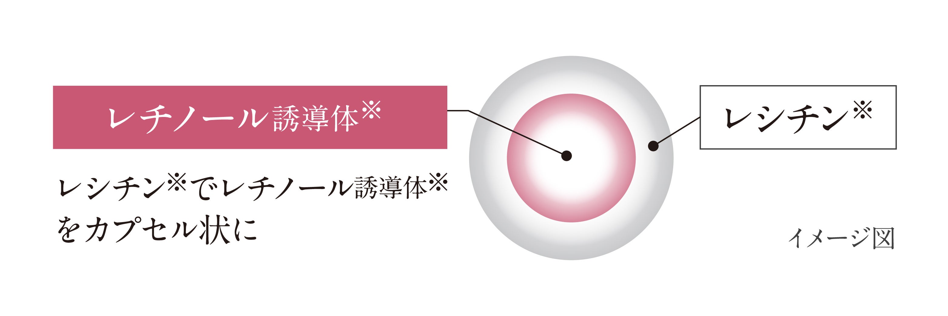 不安定なレチノール※を誘導体にして、さらにカプセルで包みこむリポソーム化で安定させています。このダブルの安定化により、壊れにくく肌に負担が少ない状態で角質層のすみずみまで成分を届けて、乾燥や年齢を重ねると気になる目元・口元を、ピンポイントで集中ケア。肌にピンッとしたハリと弾力を与えます。