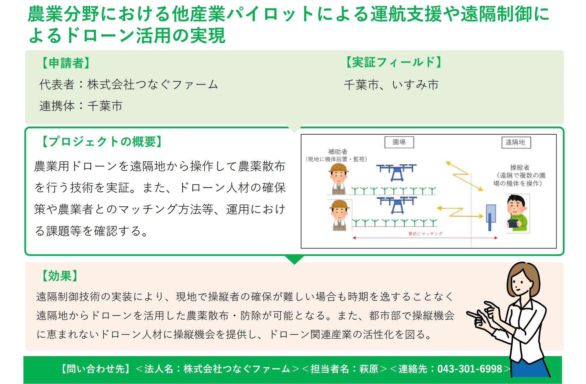 千葉大学発のベンチャー企業である千葉エコ・エネルギー株式会社(本社:千葉県千葉市、代表取締役:馬上丈司)のグループ会社であり、営農型太陽光発電やスマート農業など持続可能な農業を実践する株式会社つなぐファーム(本社:千葉県千葉市、代表取締役:蘒𠩤領)は、1/29に農業用ドローンの遠隔自動制御による農薬散布実証実験を全国で初めて*行います。