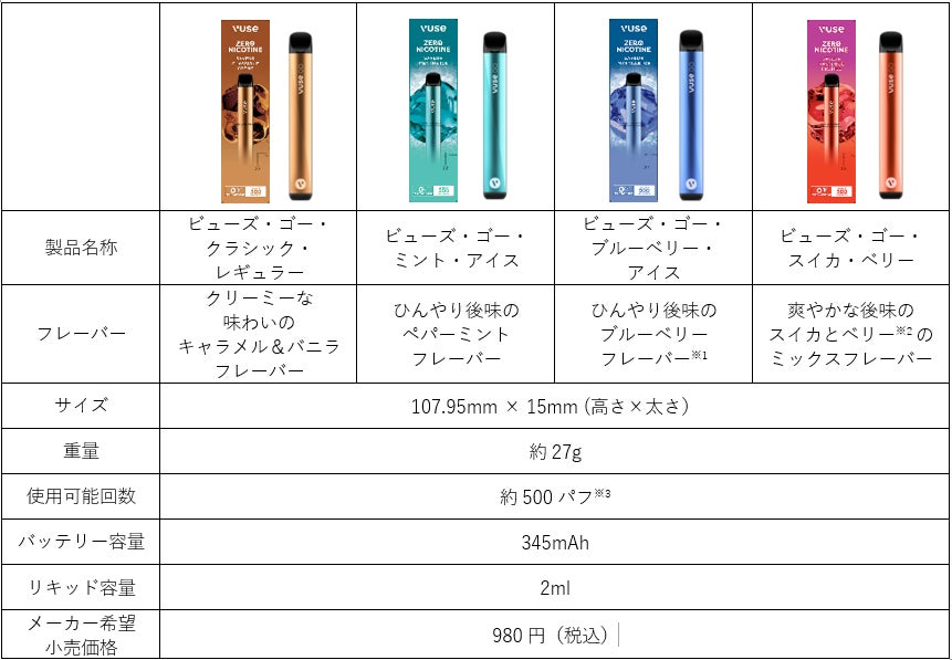 「Vuse」はBATグループのベイプ製品ブランドであり、世界の主要マーケットで展開されています。「Vuse」が提供するフレーバー体験に多くのお客様よりご好評をいただき、ベイプカテゴリーで全米No.1(*1)のシェアを持つブランドにまで成長しました。この度、非燃焼式製品の選択肢のさらなる拡大に向けて、日本のお客様からのご意見を頂戴することを目的に、「Vuse」ブランドの中でも人気の高い使い切りモデルのベイプ製品「Vuse Go」シリーズから、ゼロニコチンタイプ4銘柄を日本でテスト販売します。