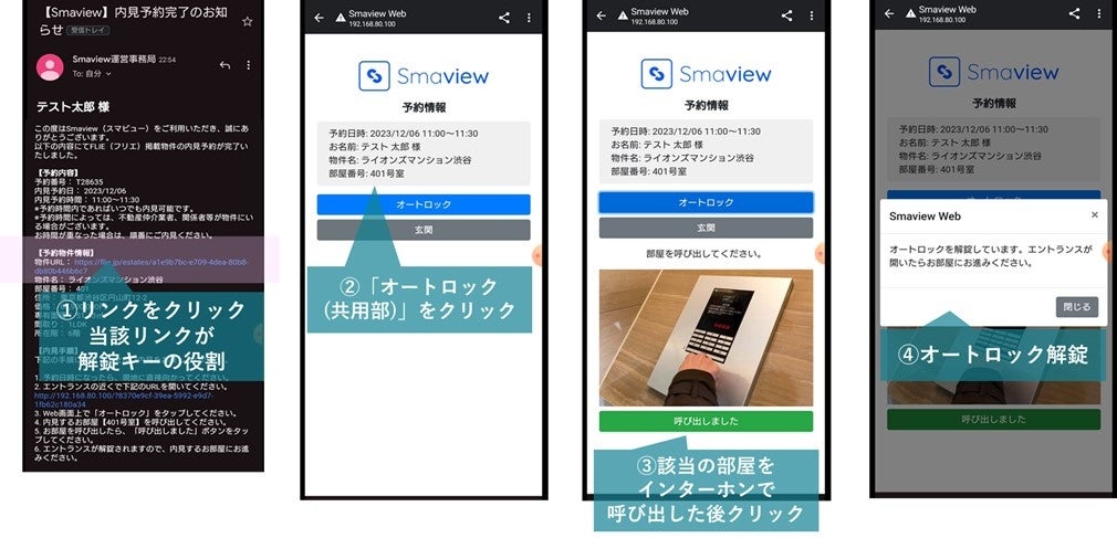 上図①~④では、不動産のセルフ内見予約から実際に予約物件に訪問した際の流れを示しております(※現行開発・検証中のトライアル版につき2024年7月リリース予定の内容では一部変更になる場合がございます)。