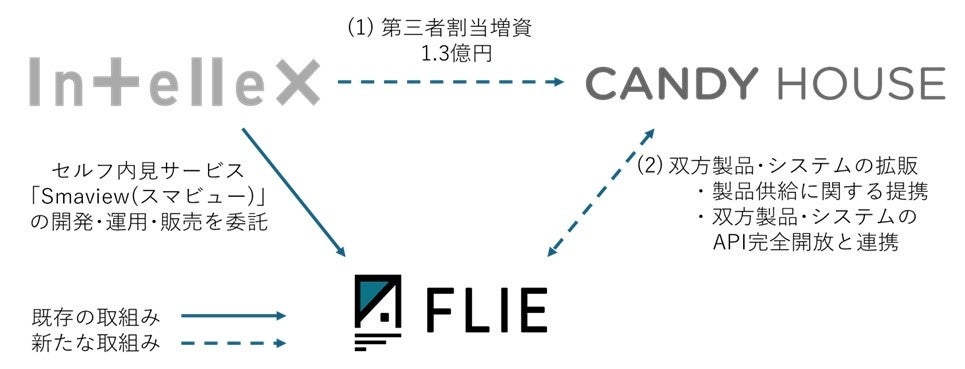 本提携は、(1)インテリックスを引受先とする第三者割当増資を通じ、CANDY HOUSE JAPAN株式会社が1億30百万円の資金調達を実施し、かつ現在セルフ内見サービス「Smaview(スマビュー)」の開発・運用・販売の委託先である株式会社FLIE(東京都中央区 代表取締役社長 井上 正賀)とCANDY HOUSE JAPAN株式会社が、(2)双方の製品・システムを連携することで、キーレスによる利便性の向上と独自の物件管理システムによる新たな世界観を実現してまいります。