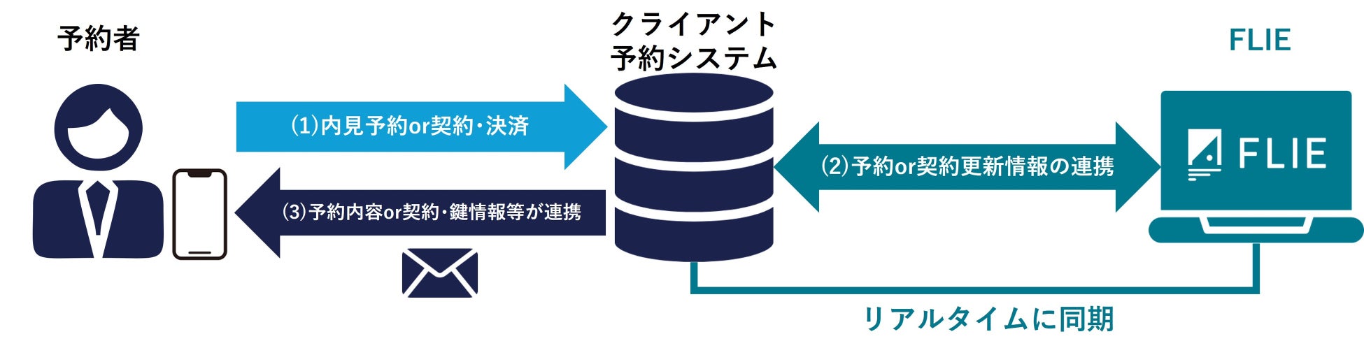 上図では、不動産のセルフ内見予約時、マンスリーマンション・民泊の予約・契約・決済後に、予約者に対して鍵情報を連携する仕組を示しております。