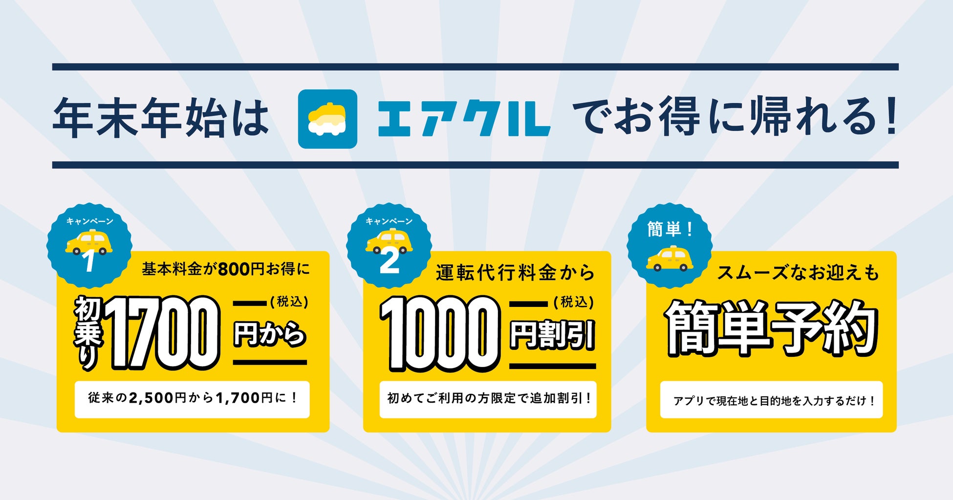 年末年始は、忘年会や新年会で飲酒の機会が増える季節。飲酒運転は絶対に避けたいものです。エアクルは、飲酒後の移動手段として、地域の方々に安心をお届けします。