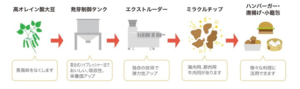 従来の植物肉は、大豆搾油後の残渣物である脱脂加工大豆を主原料としていましたが、「ミラクルミート」は原料に丸大豆まるごとを使用しています。さら、オレイン酸リッチ大豆を使用することで、大豆特有の臭みを無くし、異風味を低減しています。