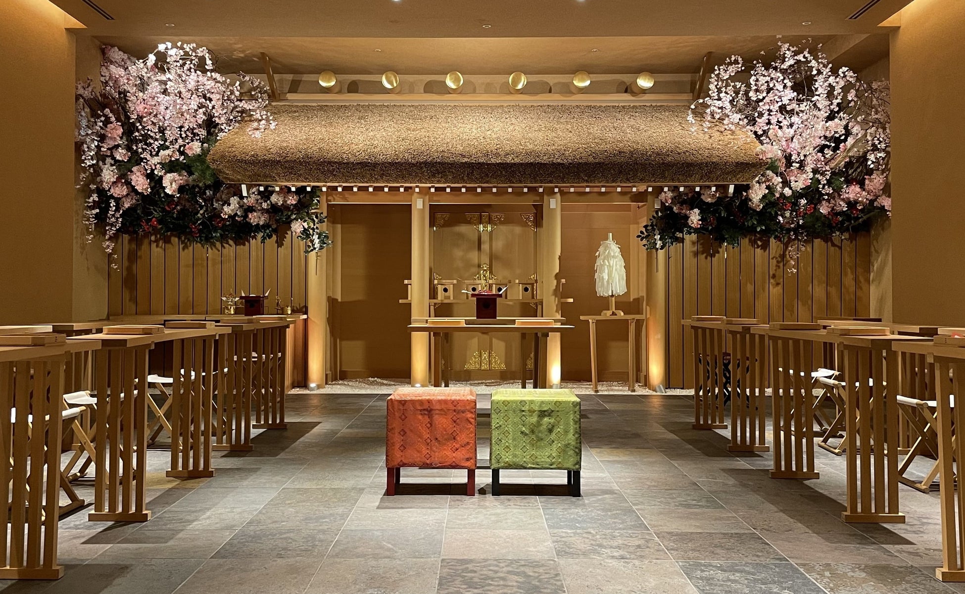 参道へかかる太鼓橋と茅葺屋根のお社が印象的な館内神殿「翔」。本物の枝木に造花を組み合わせる伝統的技法の飾り花(有職造花)がお社の周りを彩ります。
