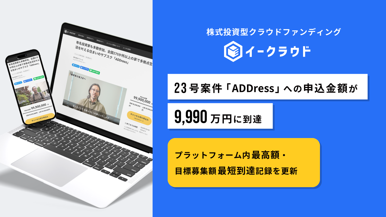 株式投資型クラウドファンディング「イークラウド」、23号案件「ADDress」への申込金額が9,990万円に到達