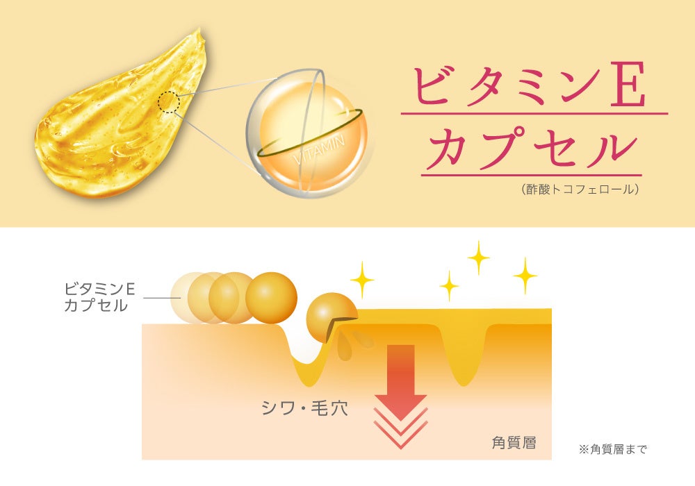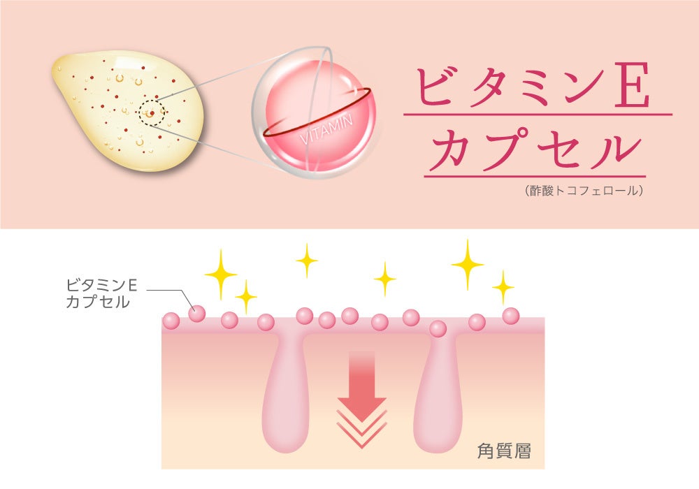 弾けたばかりのフレッシュなビタミンEが角質層まで浸透し、角質をやわらげお肌をなめらかに整えてくれます。