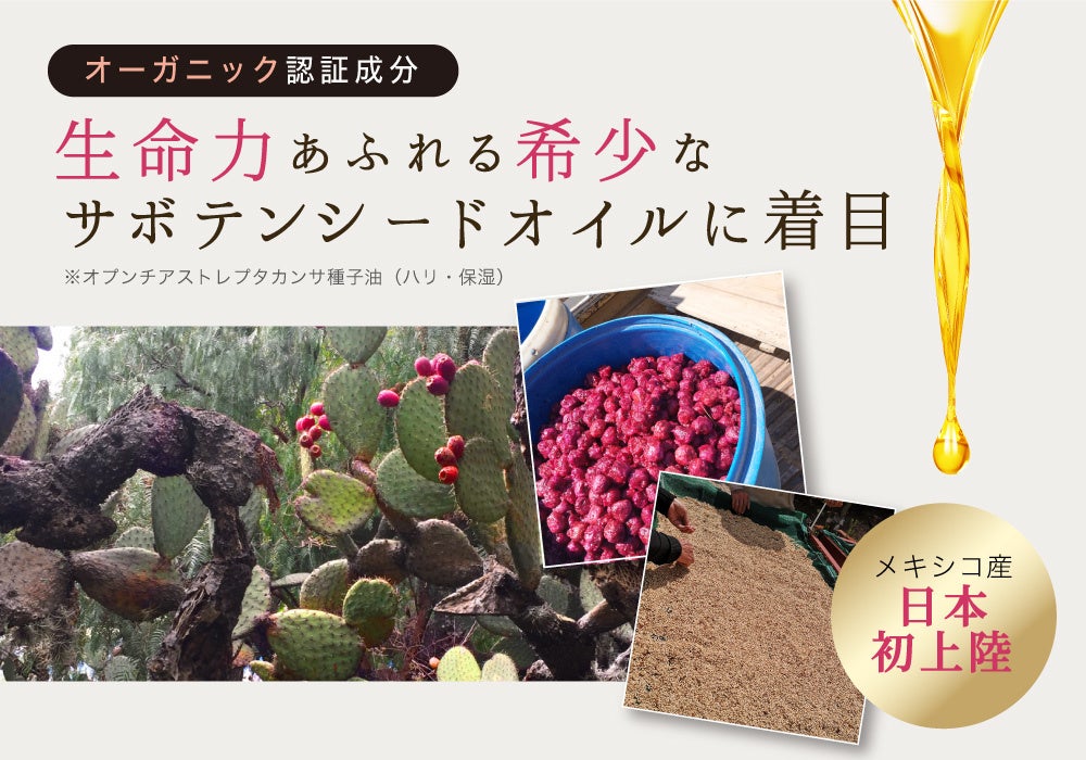 お肌をやわらげ・高い保水力を持ち・ハリやツヤを与えてくれるエイジングケアに適した特性を持つオプンチアストレプタカンサ種子油を配合する為、メキシコのオーガニック農園との交渉を重ね“サボテンシードオイル”日本初配合のスキンケアシリーズを実現しました。