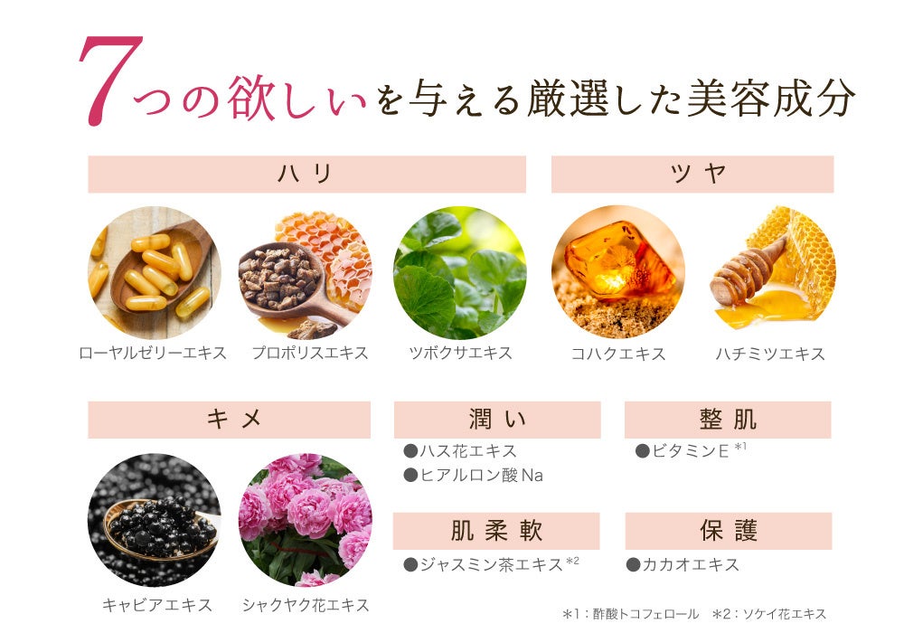 コハクエキス、プロポリスエキス、ローヤルゼリーエキスなど23種類の美容成分を贅沢に配合。