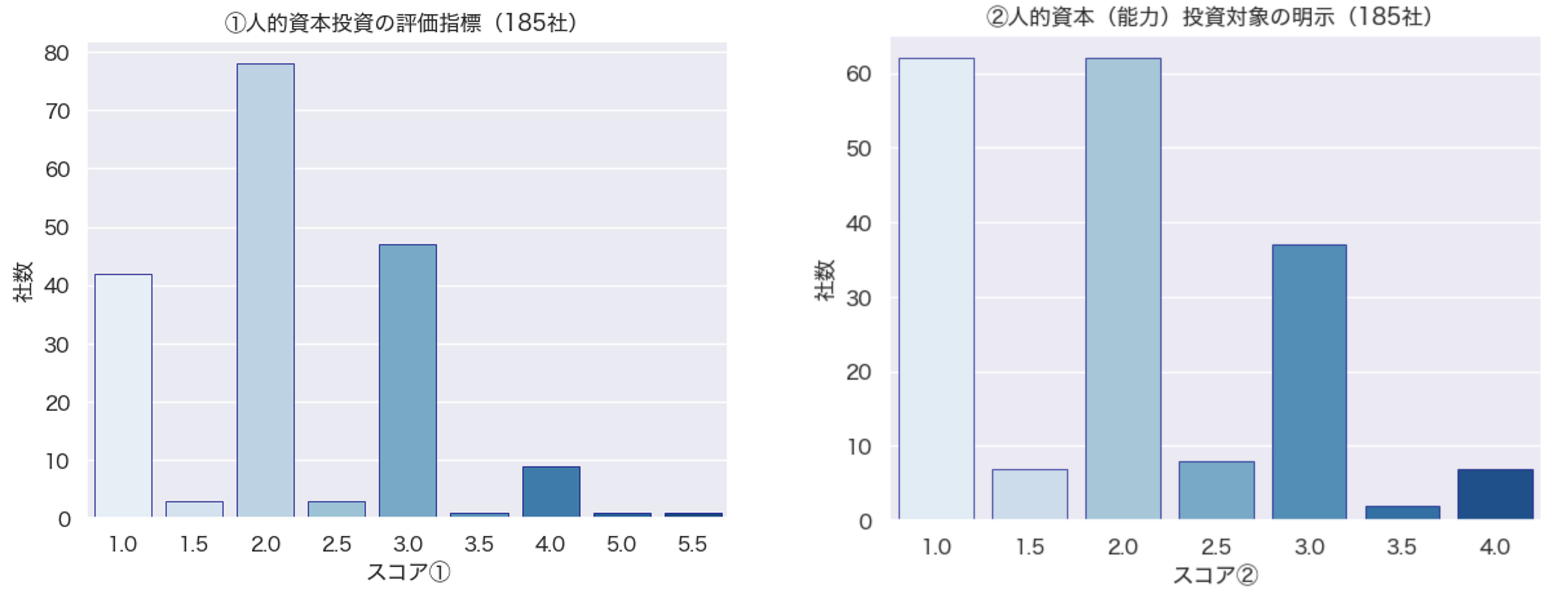 185社の平均は、合計スコアが4.13点(10点満点)、①スコアが2.17点(5点満点)、②スコアが1.96点(5点満点)となりました。「女性管理職比率」「男性育児休業等取得率」「男女間賃金格差」などの数値で出しやすい項目と異なり、人的投資に関する投資方針については、何をどこまで記載すべきなのか、多くの企業が頭を悩ませている印象を受けました。他方で人的資本投資の戦略として明確に人材の能力について開示し、経営戦略に必要な人的資本(=能力)を言語化して、目標を設定している企業もあり、経営としての人的資本へのコミットが示されておりました。