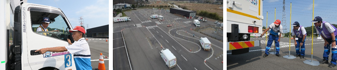 滑川福田センターでは、自動車教習所さながらのS字コースやクランク、坂道だけではなく、運送業ならではの可動式の接車バース等を備えております。研修用車両は、当社トラックの中で大半を占めている4トンワイド車と3トン車(マニュアル、オートマチック)を中心とした4台を配置しており、「モービルアイ」「バックソナー」「バックアイ」などの各種安全装置を装備。「アラウンドビューモニター」や「巻き込み防止確認ランプ」などの特殊な設備も装備されています。研修センターとしてだけではなく、自社のイベント開催や近隣の学校主催の交通安全教室会場としても活用。災害の際には避難所として地域の皆様に利用いただくことも可能です。