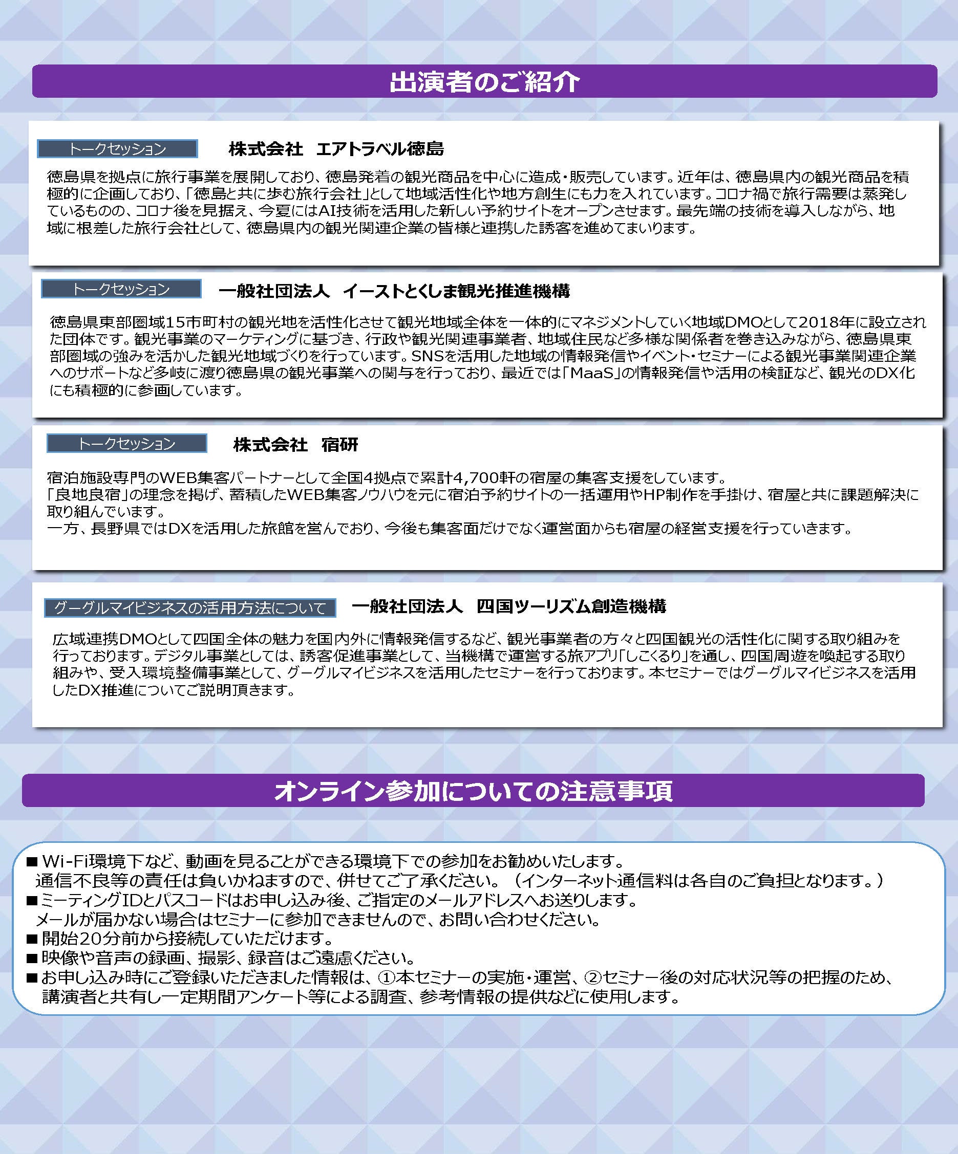 当セミナーの第1部では「DX活用による観光振興について」をテーマとしたトークセッション、第2部ではDX企業による商品やサービスのご紹介を行います。また、第3部では一般社団法人四国ツーリズム創造機構より「グーグルマイビジネスの活用方法について」紹介いたします。