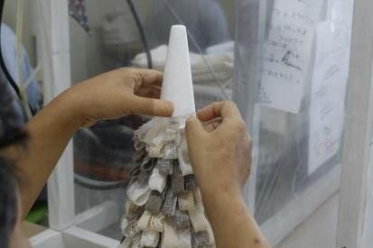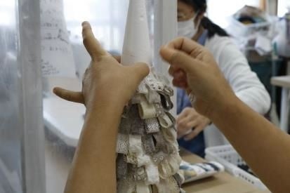 「リコットン・プロジェクト」の取組みのひとつ、オーガニックコットンの残布でつくる「クリスマスツリー」。本アイテムは障害のある方々が作業する福祉事業所「地域作業所hana」とのコラボ商品です。