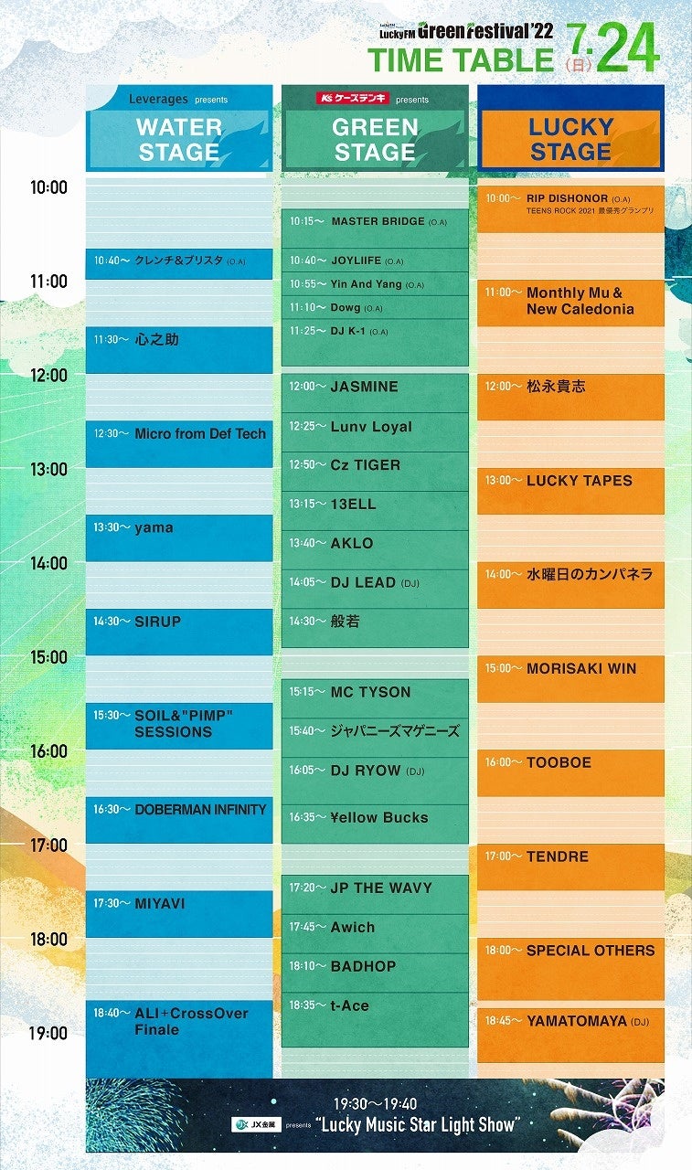 24日のWATER STATGEはエッジの効いたサウンドでヘッドライナーはALIが務め、「クロスオーバー・フィナーレ」の後に花火とともに終幕を迎える予定です。GREEN STAGEはHIP-HOPでヘッドライナーは水戸出身のt-Ace、 LUCKY STAGEは前日同様に距離の近いステージならではの一体感あるサウンドを展開する予定です。この日はWATER STAGEとLUCKY STAGEの時間を交互に組んでいる一方で、GREEN STAGEは全国の旬なHIP-HOPアーティストが一堂に会するため転換がほとんどない予定です。クロスオーバーを色濃く感じるサウンドをノンストップで楽しみたい方は、24日がおすすめです。