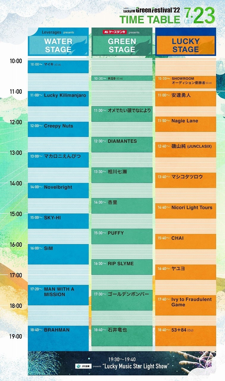 株式会社茨城放送(本社所在地:茨城県水戸市)は、 国営ひたち海浜公園で7月23日(土)、 24日(日)に開催するLuckyFM Green Festival(通称:LuckyFes)のタイムテーブルを発表しました。 LuckyFesは「クロスオーバー」をコンセプトに掲げており、POPSやROCK、HIPHOP、JAZZやEDM、世代を超えたメガヒッツなどLuckyFMの番組に連動させて多種多様な音楽をお届けする予定です。