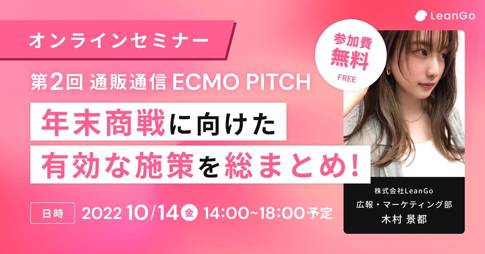 株式会社LeanGo(本社:東京都品川区、代表取締役:平井 翔吏 以下 弊社)は、今月2022年10月14日(金)14:00〜18:00の第2回「通販通信ECMO PITCH」~年末商戦に向けた今年の傾向と有効な施策を総まとめ~の無料オンラインセミナーに弊社木村が登壇いたします。