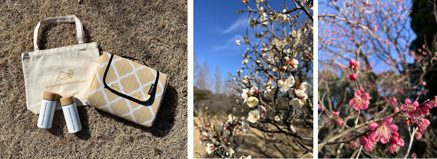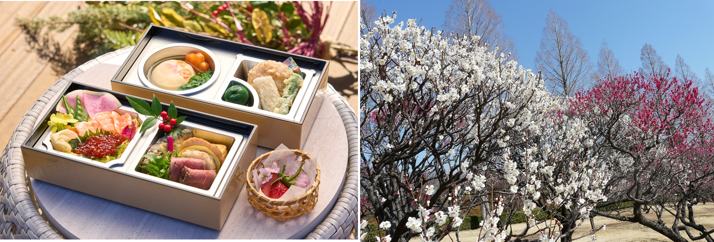 - 蝋梅、紅梅、しだれ梅、豊後梅、白加賀梅、野梅、緑縁梅など約450本の梅が咲き誇るリソルの森の梅園。2月中旬~3月中旬にかけての見ごろにあわせ、気軽にお花見ピクニックが楽しめると好評の梅見弁当が今年も登場。