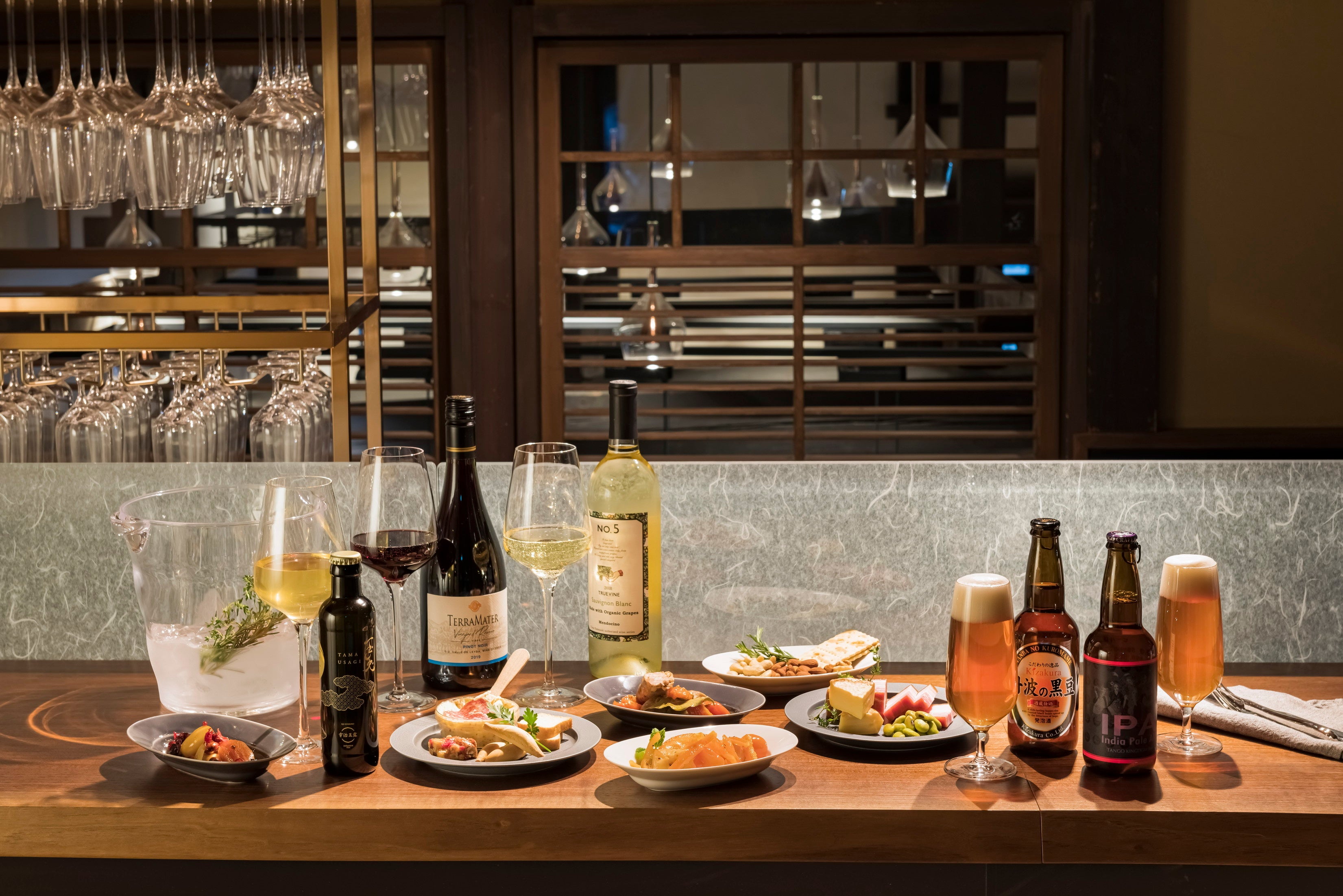 メニュー例: ボトルワイン(赤・白 各種)グラスワイン(赤・白 各3種)、おつまみ約20種(3種のナチュラルチーズと京鴨ナッツ、ガリシア産タコ&スモークモッツァレラのアヒージョ、サルシッチャのアーリオオーリオ、マスカルポーネいぶりがっこ、神戸牛のアヒージョなど)