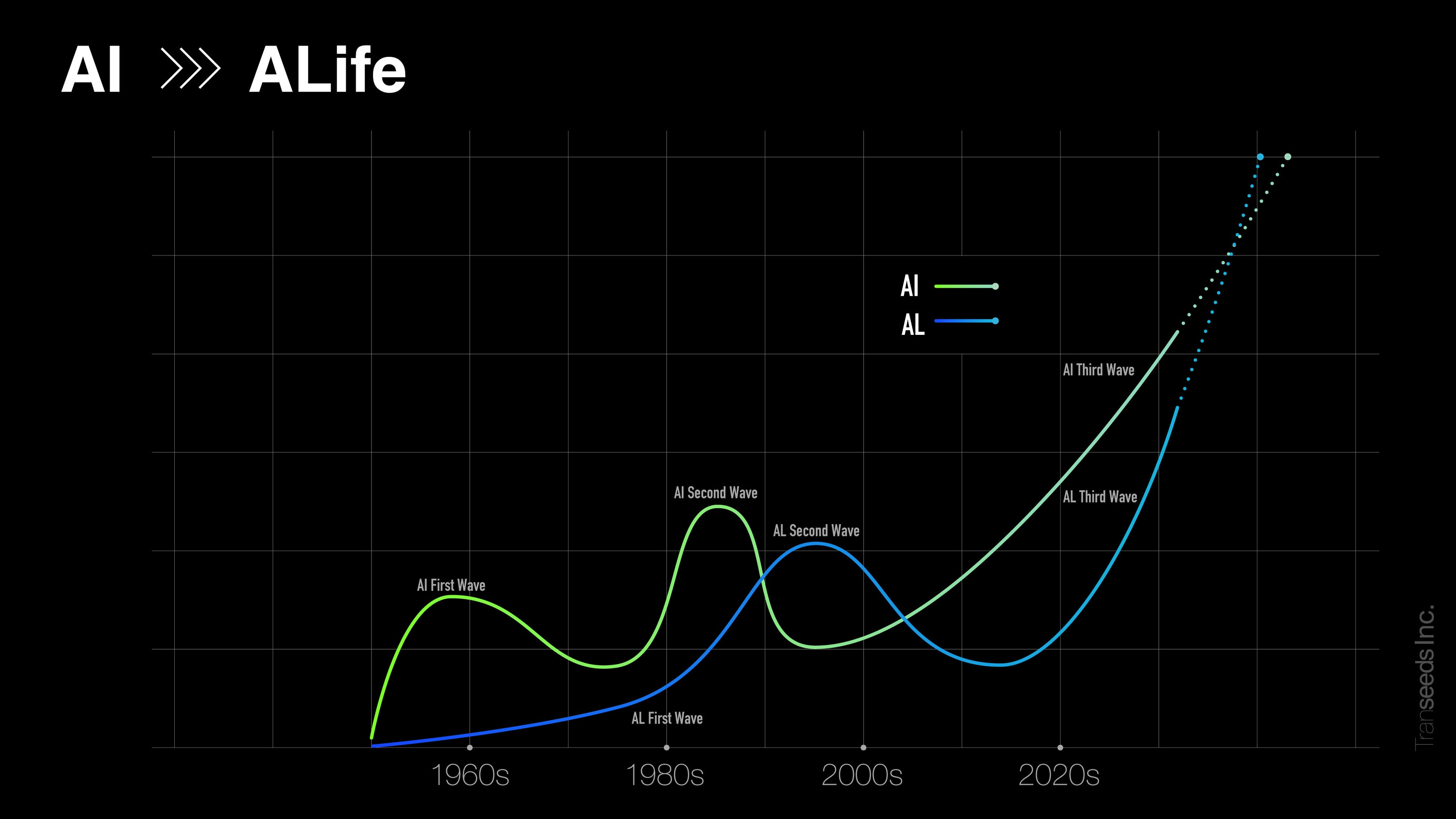 Transeeds Inc. sees beyond the peak of the third AI boom toward the next transformation: a shift from AI to ALife. Our aim is to expand this movement beyond technology into art and entertainment, making possible real, three-dimensional encounters with beings that once existed only in two dimensions. New forms of emotion, pleasure, and experience will continue to emerge through this future.