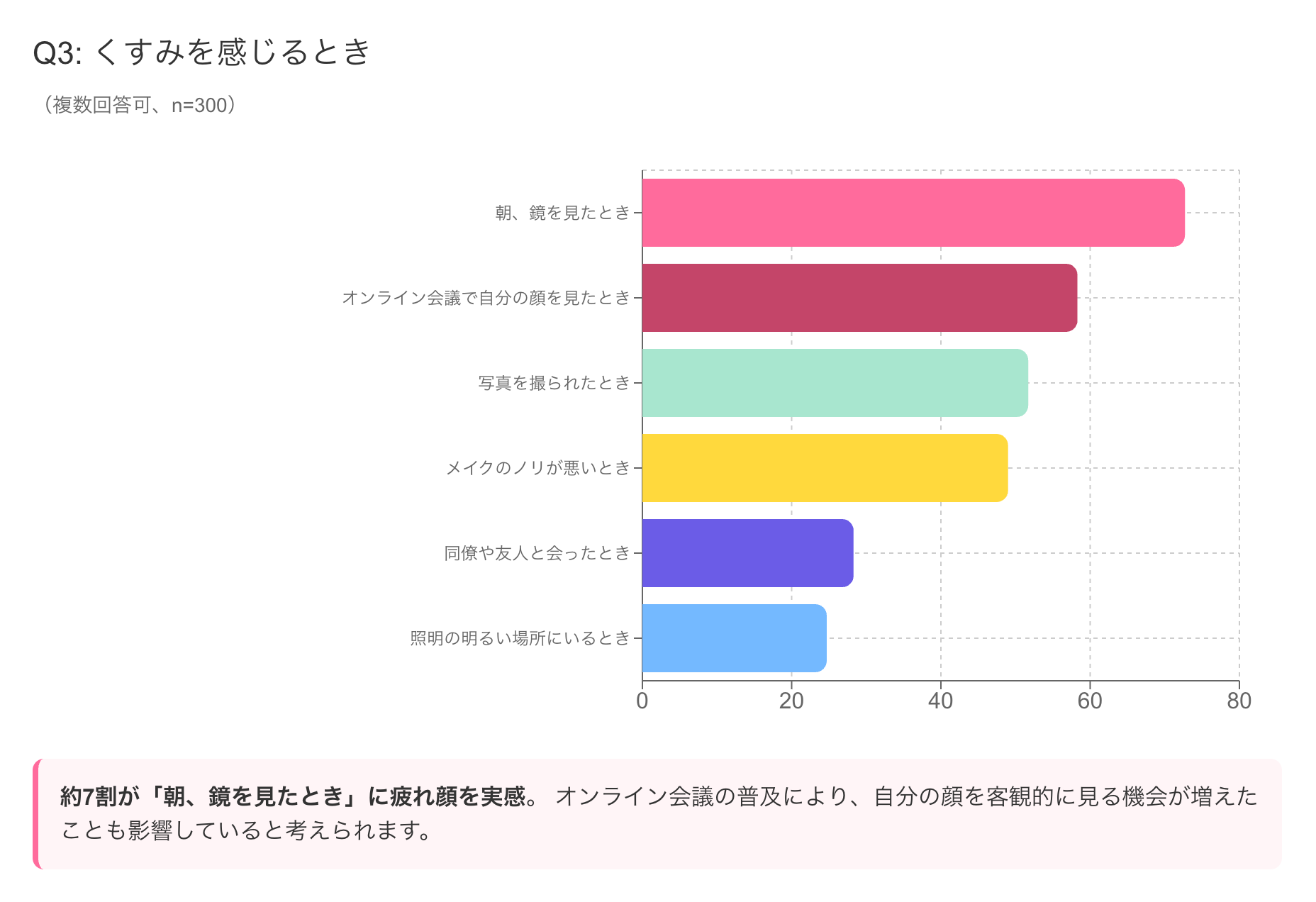 結果: 1位: 朝、鏡を見たとき(72.7%) 2位: オンライン会議で自分の顔を見たとき(58.3%) 3位: 写真を撮られたとき(51.7%) 4位: メイクのノリが悪いとき(49.0%) 5位: 同僚や友人と会ったとき(28.3%) 6位: 照明の明るい場所にいるとき(24.7%)