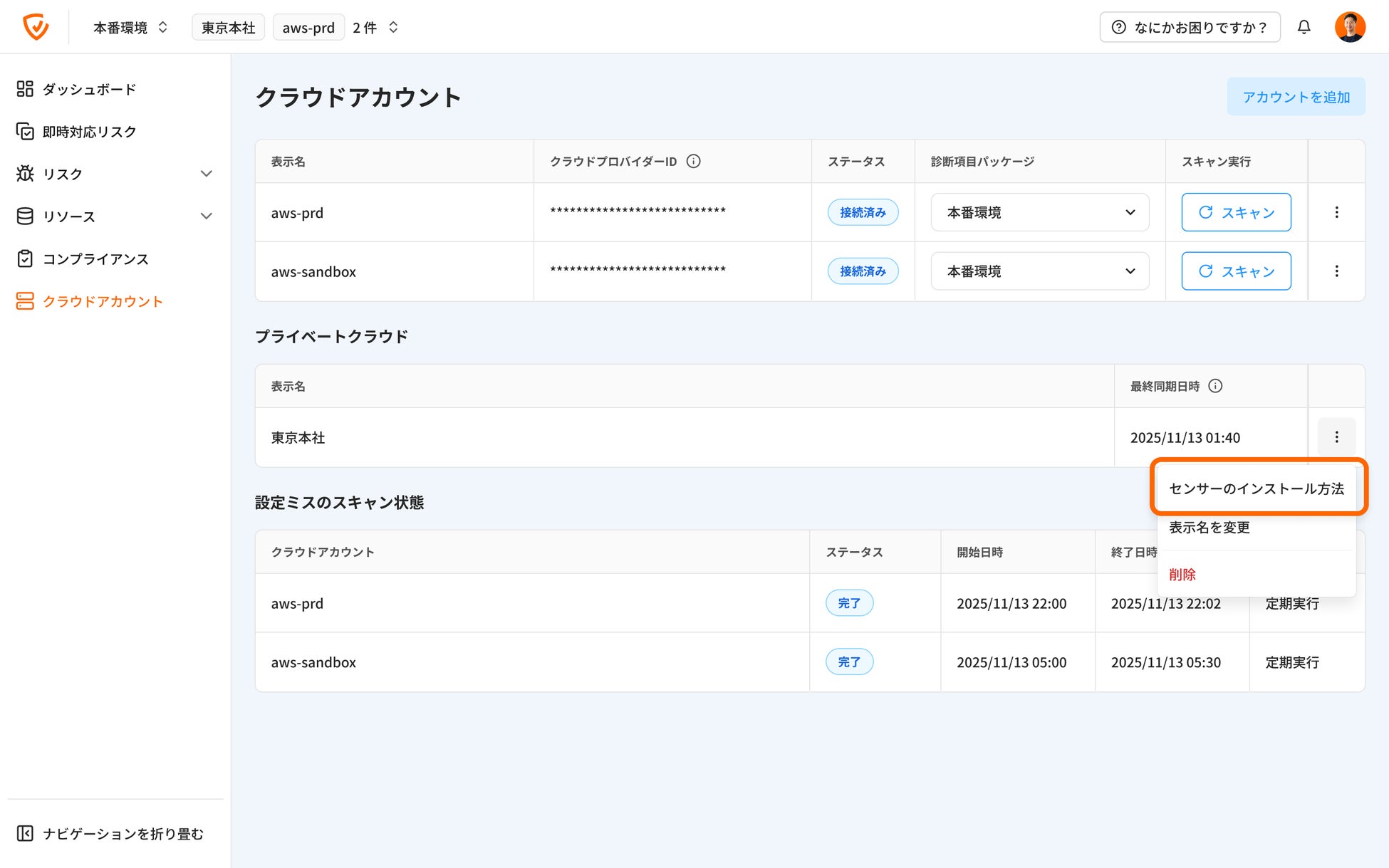 「クラウドアカウント」ページで、接続済みクラウドアカウント一覧の各行にある「 ⋮ 」メニューをクリックします。