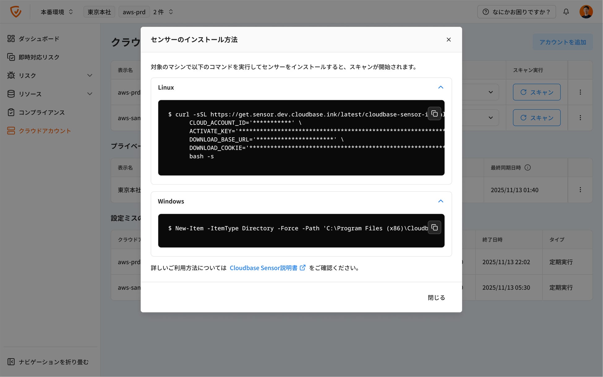 3. Windows のCloudbase Sensorのインストールコマンドが表示されますので、コピー&ペーストを行い対象マシン上のPowershellで実行してください。これによりインストールが完了します。