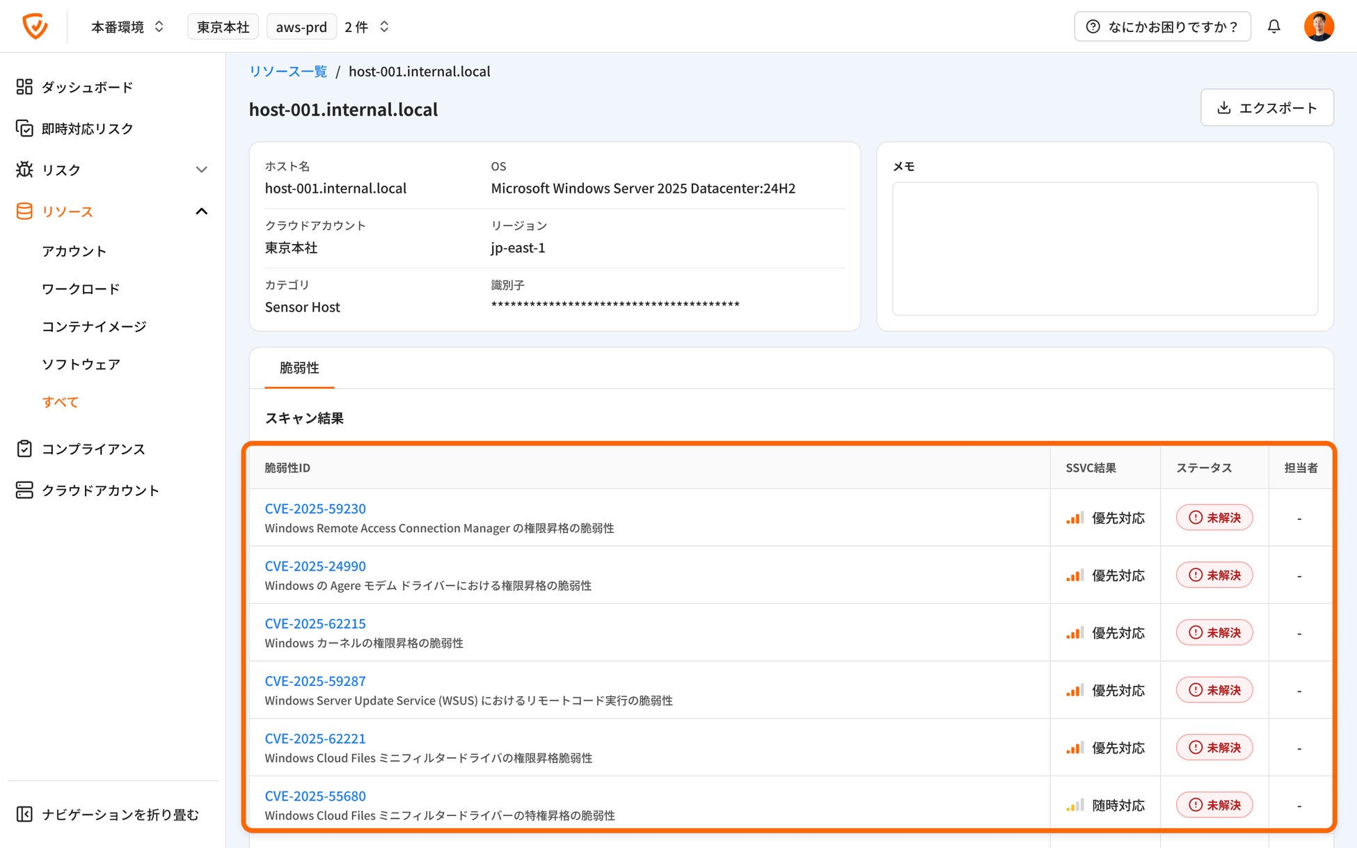 スキャンが実施された後、スキャン結果はリソース詳細より確認いただけます。