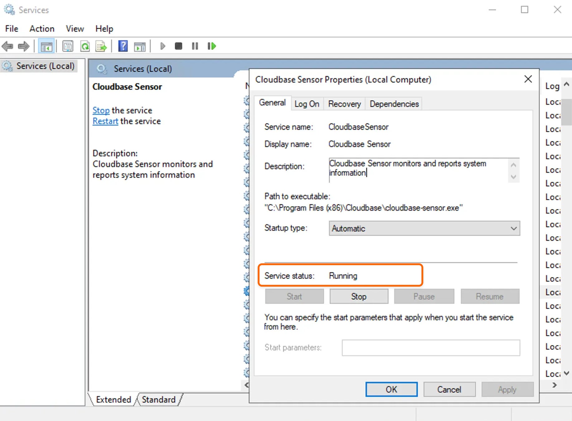 インストール成功後、Cloudbase SensorがWindowsサービスとして稼働されていることを以下のようにマシンで確認できます。