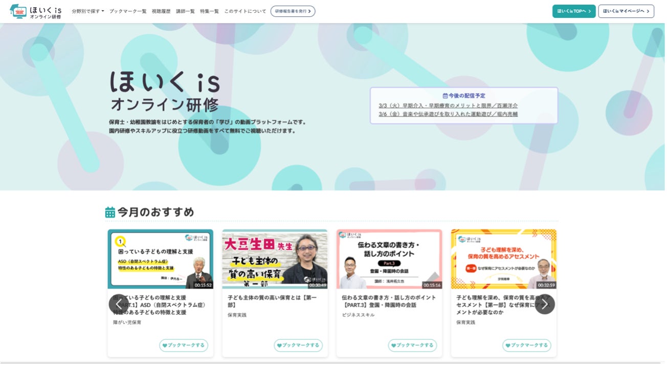 ほいくisオンライン研修は、保育に役立つさまざまな情報を配信する保育士・幼稚園教諭向け動画プラットフォームです。各分野の専門家を講師に迎え、保育の基礎知識から実践まで500本以上の動画を配信しています。動画1本あたり5〜15分程度なので、スキマ時間に学べることが特徴です。2024年のサービス開始以降、全国の保育士・幼稚園教諭の皆様にご利用いただいています。