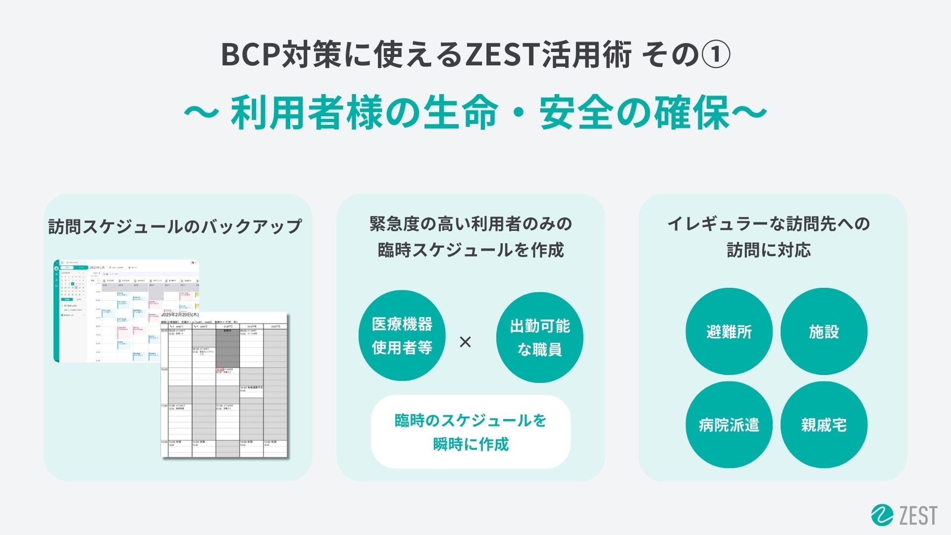 そこで私たちは、これらの課題解決に貢献するため、「ZEST」を活用した「毎日の通常業務の中でできる」「日々のスケジュール調整の延長でできる」BCP対策をご紹介します。