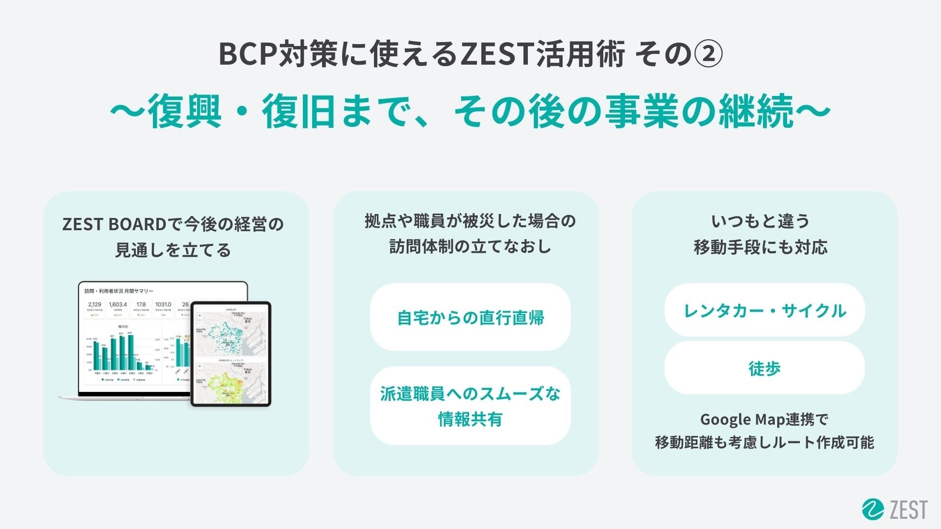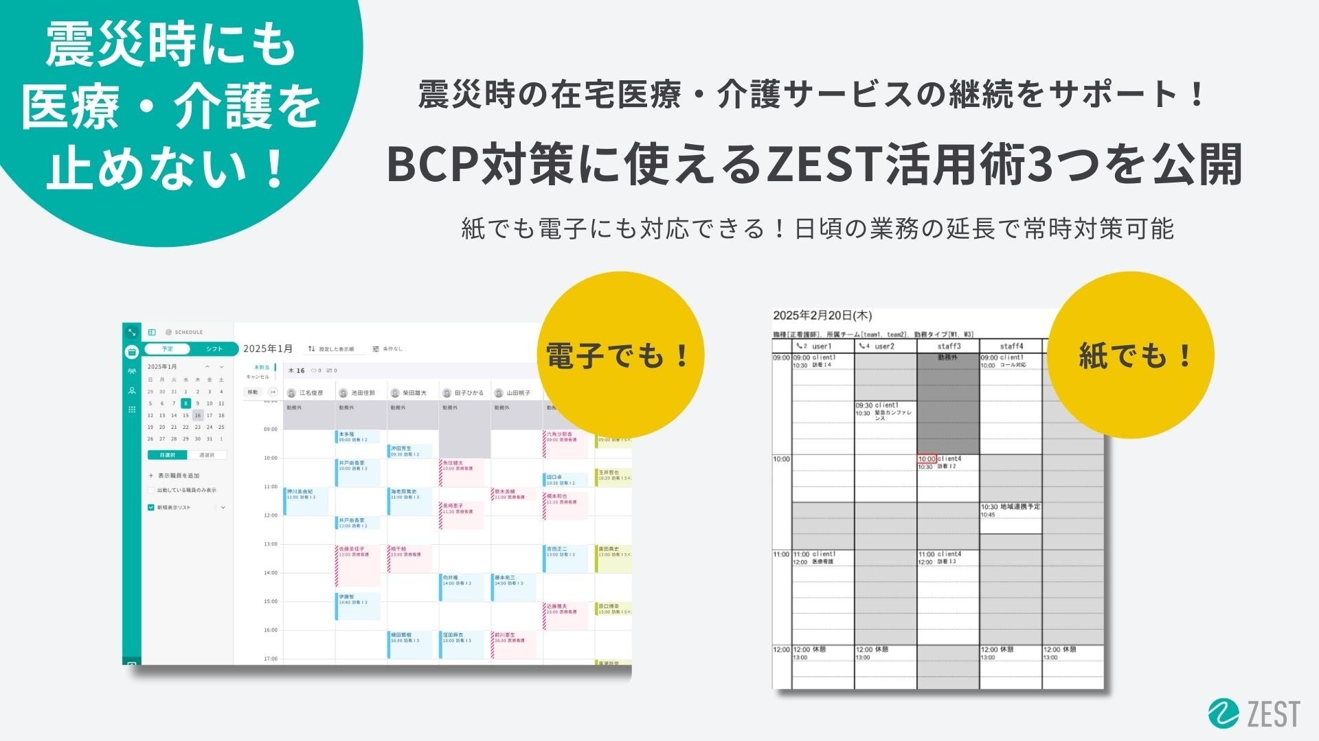 在宅医療・介護の収益改善プラットフォーム「ZEST」を展開する株式会社ゼスト(本社:東京都新宿区、代表取締役社長:一色淳之介)は、在宅医療・介護事業者様向けに、BCP対策にお使いいただけるZEST活用術を公開したことをお知らせいたします。