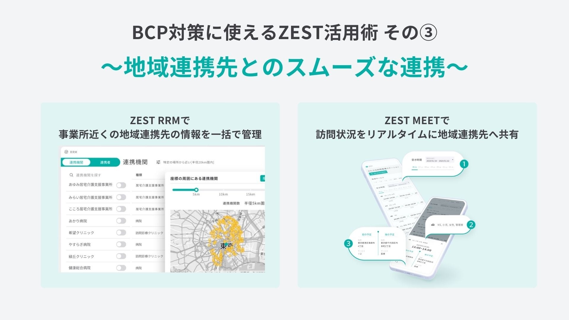 1つ目は、戦略的でスムーズな営業活動をサポートする「ZEST RRM」。2つ目は、事業所の空き状況をURL1つで地域連携先に共有でき、やり取りをスムーズに行っていただける「ZEST MEET」です。