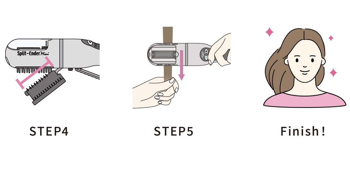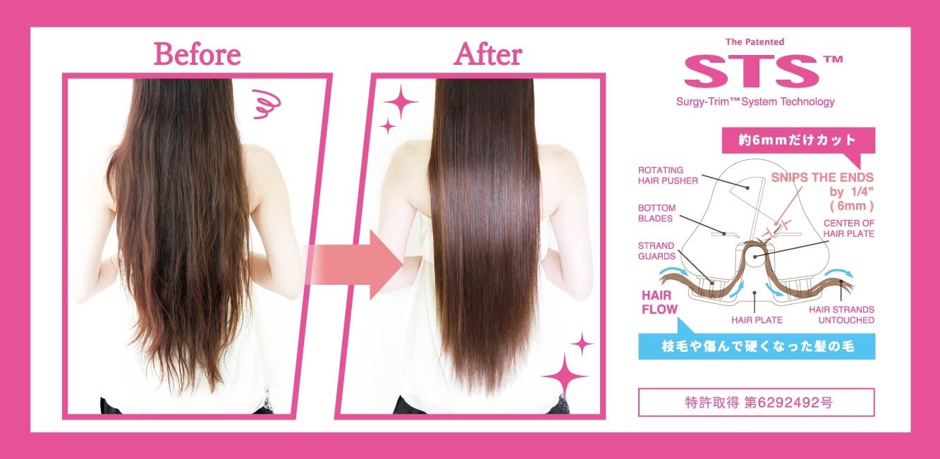 難しい施術は一切ナシ!髪を挟んでスライドするだけ!長さを変えずに傷んだ毛先だけを安全に素早くカットし、魅惑のロングヘアもツヤあふれる髪へと導きます。