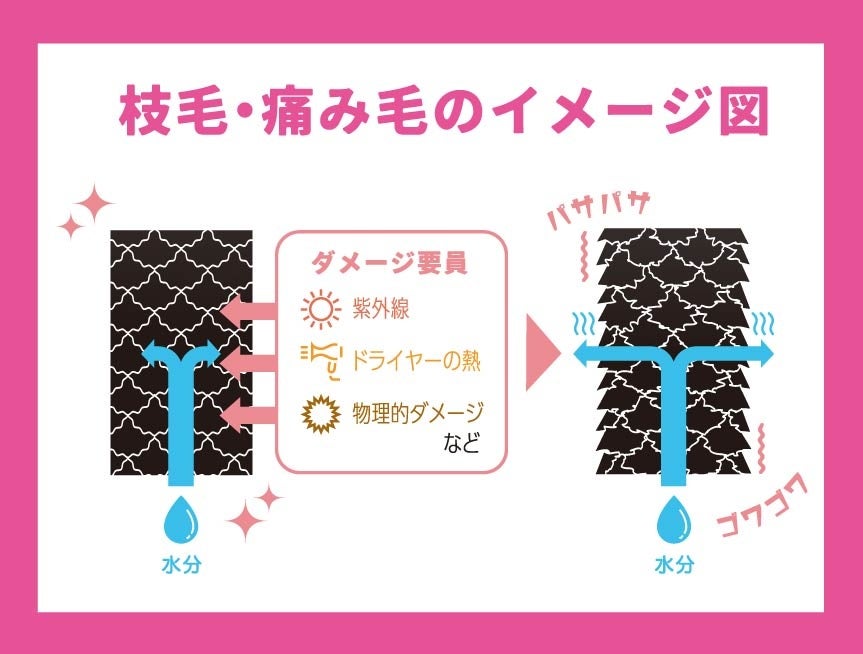 これが、枝毛やダメージ毛の根本的な原因です。枝毛は一度できてしまったら修復できません。枝毛やダメージ毛が目立つと、おさまりや手触りも良くなく、髪のツヤも見えなくなります。