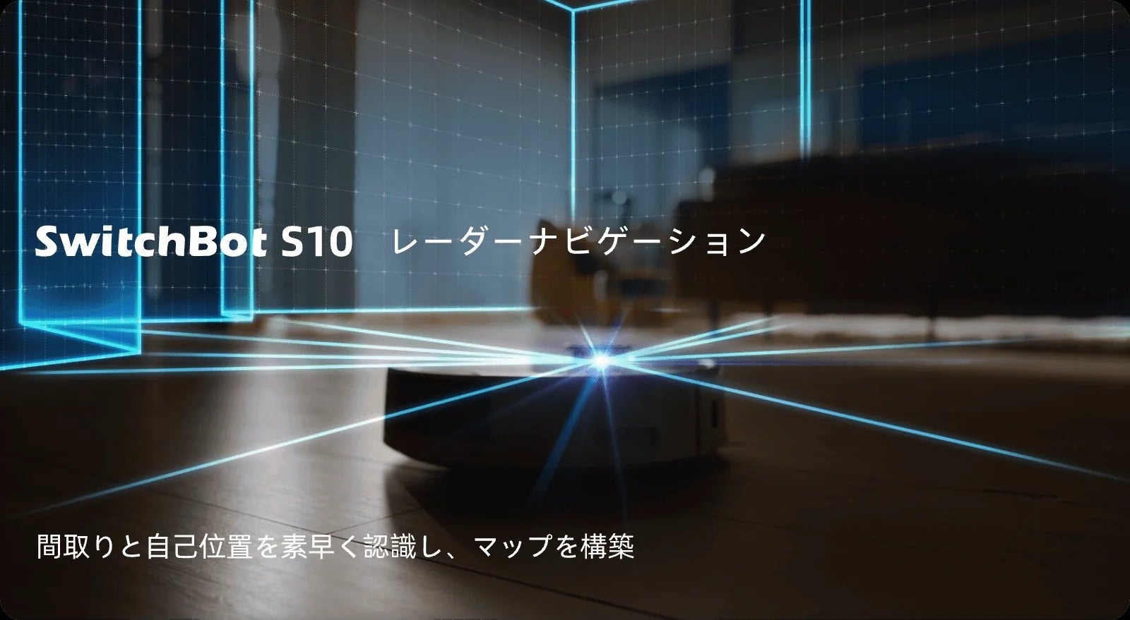 また、高精度レーダーナビゲーションシステム搭載で、間取りと自己位置を素早く認識し、マップを構築。より高い清掃カバー率で効率的に清掃を行ないます。また、SwitchBotアプリに繋いで、スマホから進入禁止エリアやバーチャルウォール、部屋指定清掃などの設定が可能です。